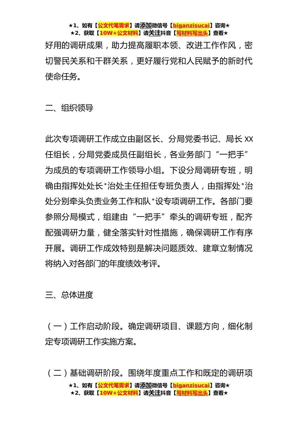 ★1、如有【公文代笔需求】请添加微信号【biganzisucai】咨询★★2、获取【10W+公文材料】请关注抖音【写材料写出头】查看★关于集中开展G安业务工作和队*设专项调研工作的实施方案为深入贯彻落实习近平总书记关于调查研究的重要论述,按照市局的安排部署,推动全局*调查研究之风,扎实开展以问题为导向的调查研究,有力助推XX*工作高质量发展,分局决定在全局范围内集中开展XX*业务工作和队*设专项调研工作,制定方案如下。一、目标任务对标打造“世界一流的*城市、世界一流的警务模式和世界一流的警察形象”工作目标,围绕市局“加强政治建警、强化‘砺剑’行动与打击整治、执法规范化建设、智慧*建设、基层基础建设”等*重点课题调研任务,坚持以调研开局、以调研开路,切实摸清业务工作和队*设的现状、特点和...