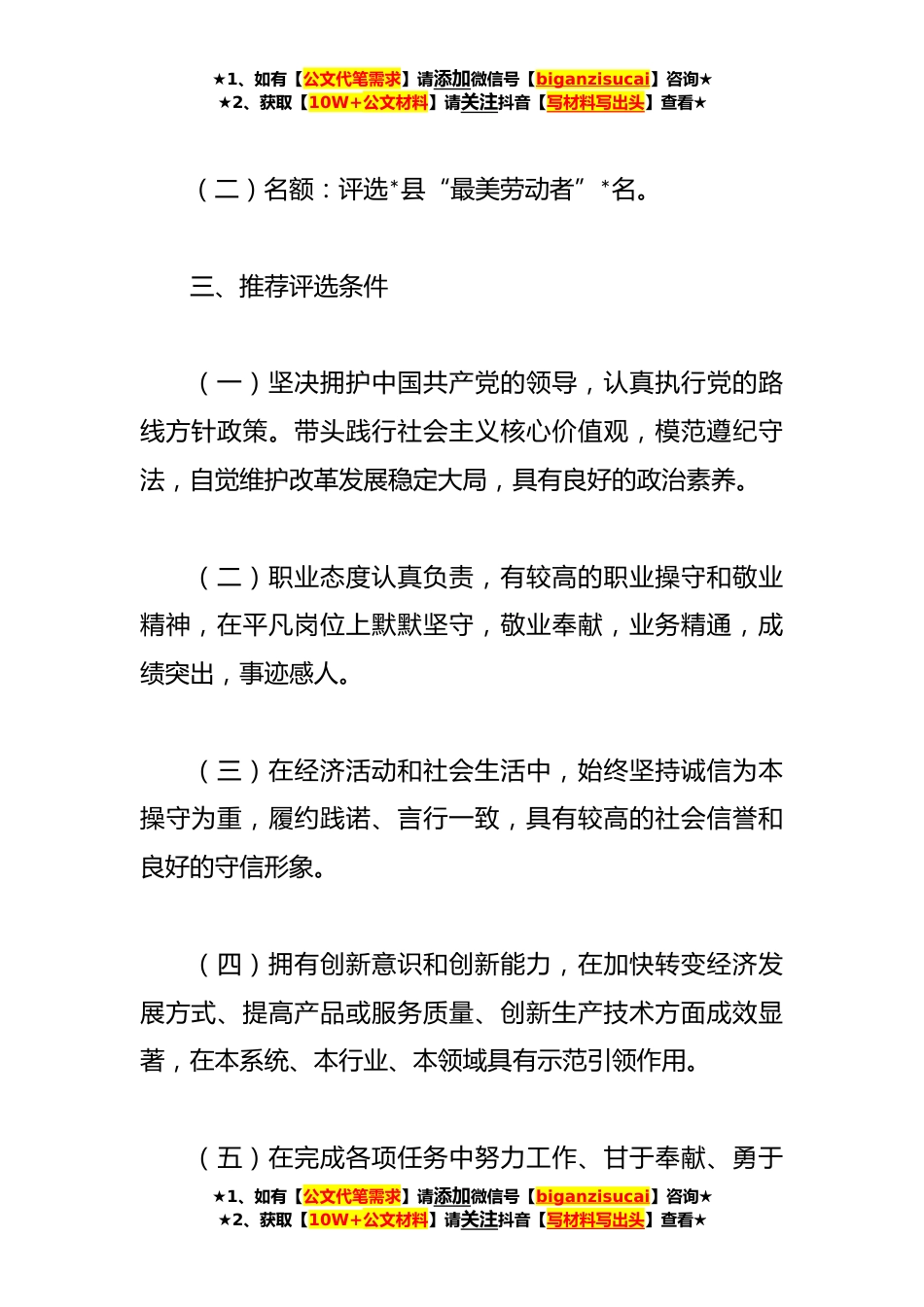★1、如有【公文代笔需求】请添加微信号【biganzisucai】咨询★★2、获取【10W+公文材料】请关注抖音【写材料写出头】查看★“最美劳动者”推荐评选工作实施方案根据__县委精神文明建设指导委员会《关于开展“最美”系列评选活动的通知》精神要求,现就做好全县“最美劳动者”推荐评选工作通知如下:一、指导思想以习近平新时代中国特色社会主义思想为指导,深入贯彻落实党的二十大精神,不断深化新时代公民思想道德建设,积极培育和践行社会主义核心价值观,通过开展“最美劳动者”评选活动,不断发掘宣传社会认同的先进典型,展示*县道德建设成果和先进典型风采,激励广大干群争当先进,在全社会营造见贤思齐的浓厚氛围,为争创全国文明城县,建设“*”凝聚精神力量。二、推荐评选对象和名额(一)评选对象:*县...
