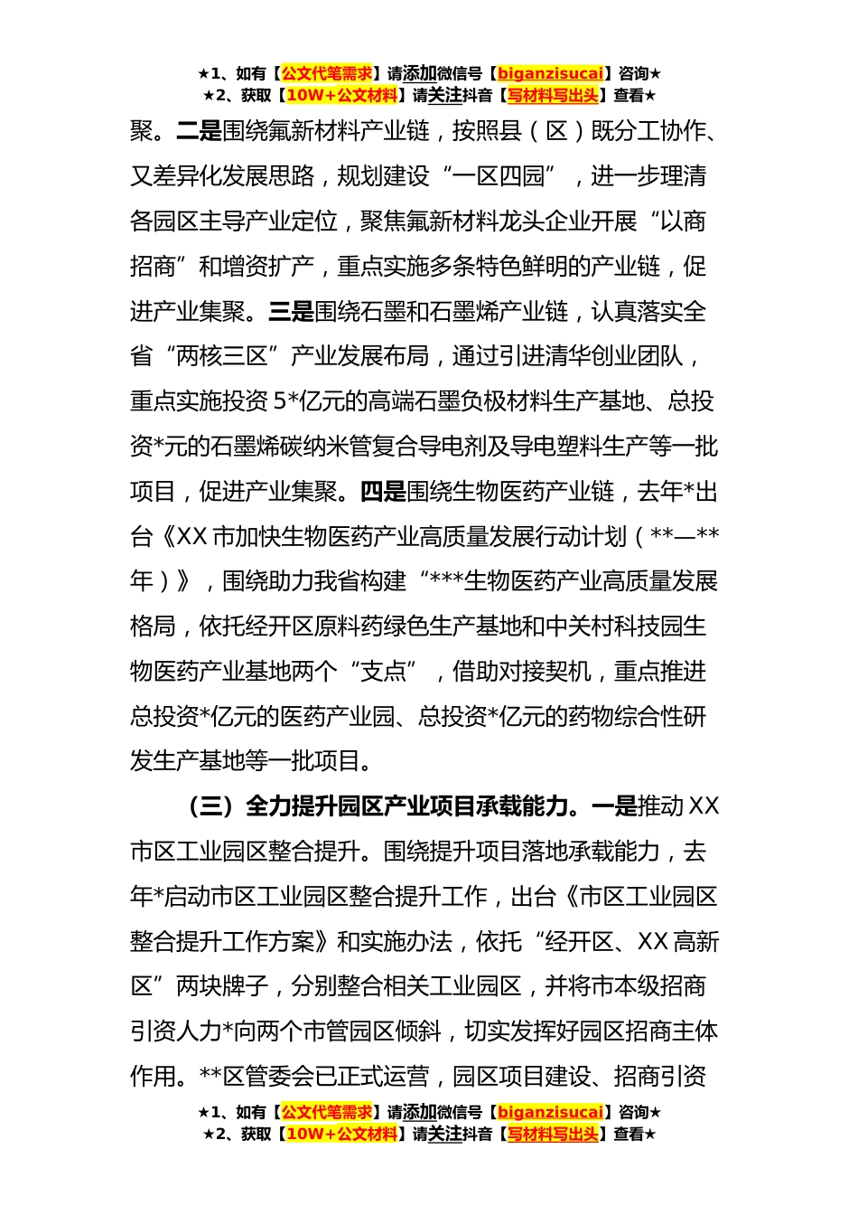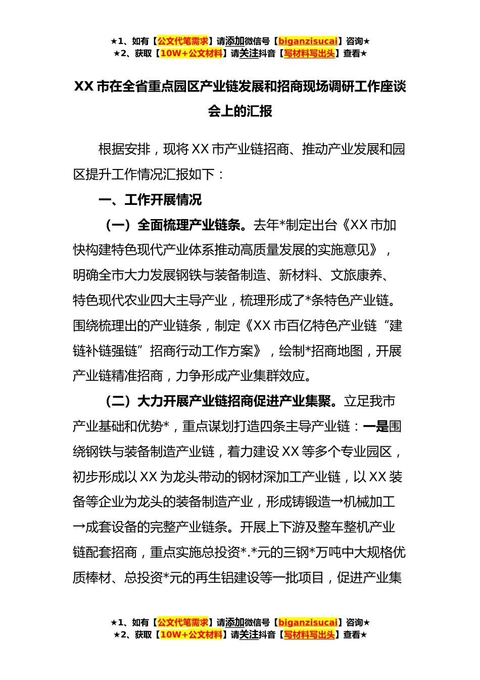 ★1、如有【公文代笔需求】请添加微信号【biganzisucai】咨询★★2、获取【10W+公文材料】请关注抖音【写材料写出头】查看★XX市在全省重点园区产业链发展和招商现场调研工作座谈会上的汇报根据安排,现将XX市产业链招商、推动产业发展和园区提升工作情况汇报如下:一、工作开展情况(一)全面梳理产业链条。去年*制定出台《XX市加快构建特色现代产业体系推动高质量发展的实施意见》,明确全市大力发展钢铁与装备制造、新材料、文旅康养、特色现代农业四大主导产业,梳理形成了*条特色产业链。围绕梳理出的产业链条,制定《XX市百亿特色产业链“建链补链强链”招商行动工作方案》,绘制*招商地图,开展产业链精准招商,力争形成产业集群效应。(二)大力开展产业链招商促进产业集聚。立足我市产业基础和优势*,重...