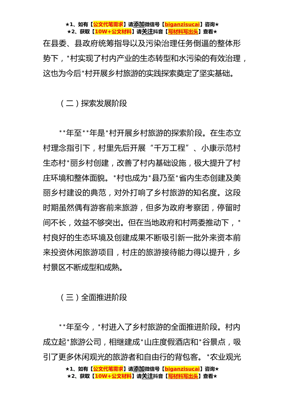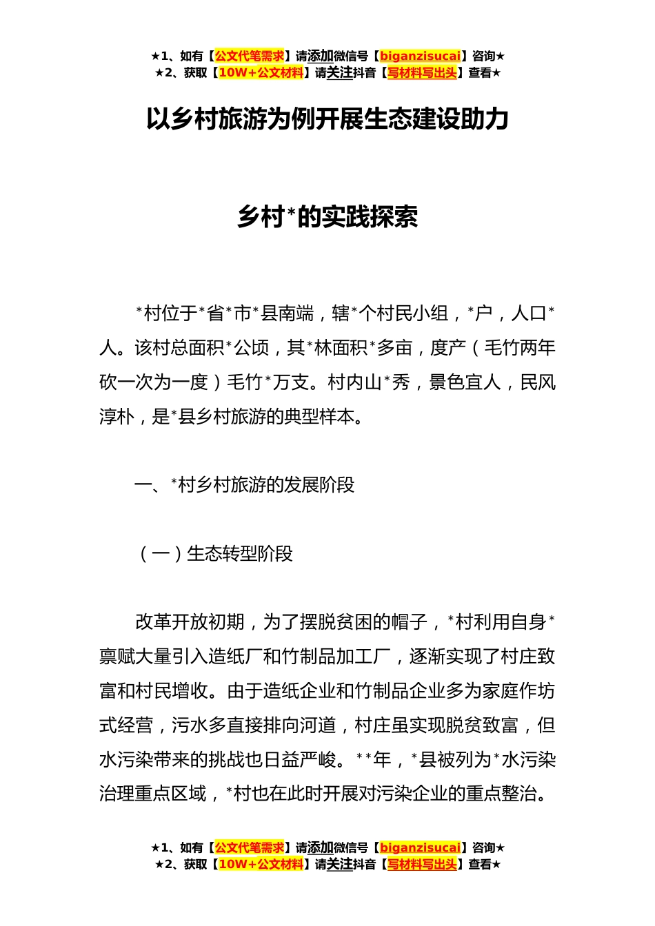 ★1、如有【公文代笔需求】请添加微信号【biganzisucai】咨询★★2、获取【10W+公文材料】请关注抖音【写材料写出头】查看★以乡村旅游为例开展生态建设助力乡村*的实践探索*村位于*省*市*县南端,辖*个村民小组,*户,人口*人。该村总面积*公顷,其*林面积*多亩,度产(毛竹两年砍一次为一度)毛竹*万支。村内山*秀,景色宜人,民风淳朴,是*县乡村旅游的典型样本。一、*村乡村旅游的发展阶段(一)生态转型阶段改革开放初期,为了摆脱贫困的帽子,*村利用自身*禀赋大量引入造纸厂和竹制品加工厂,逐渐实现了村庄致富和村民增收。由于造纸企业和竹制品企业多为家庭作坊式经营,污水多直接排向河道,村庄虽实现脱贫致富,但水污染带来的挑战也日益严峻。**年,*县被列为*水污染治理重点区域,*村也在此时开展对污...