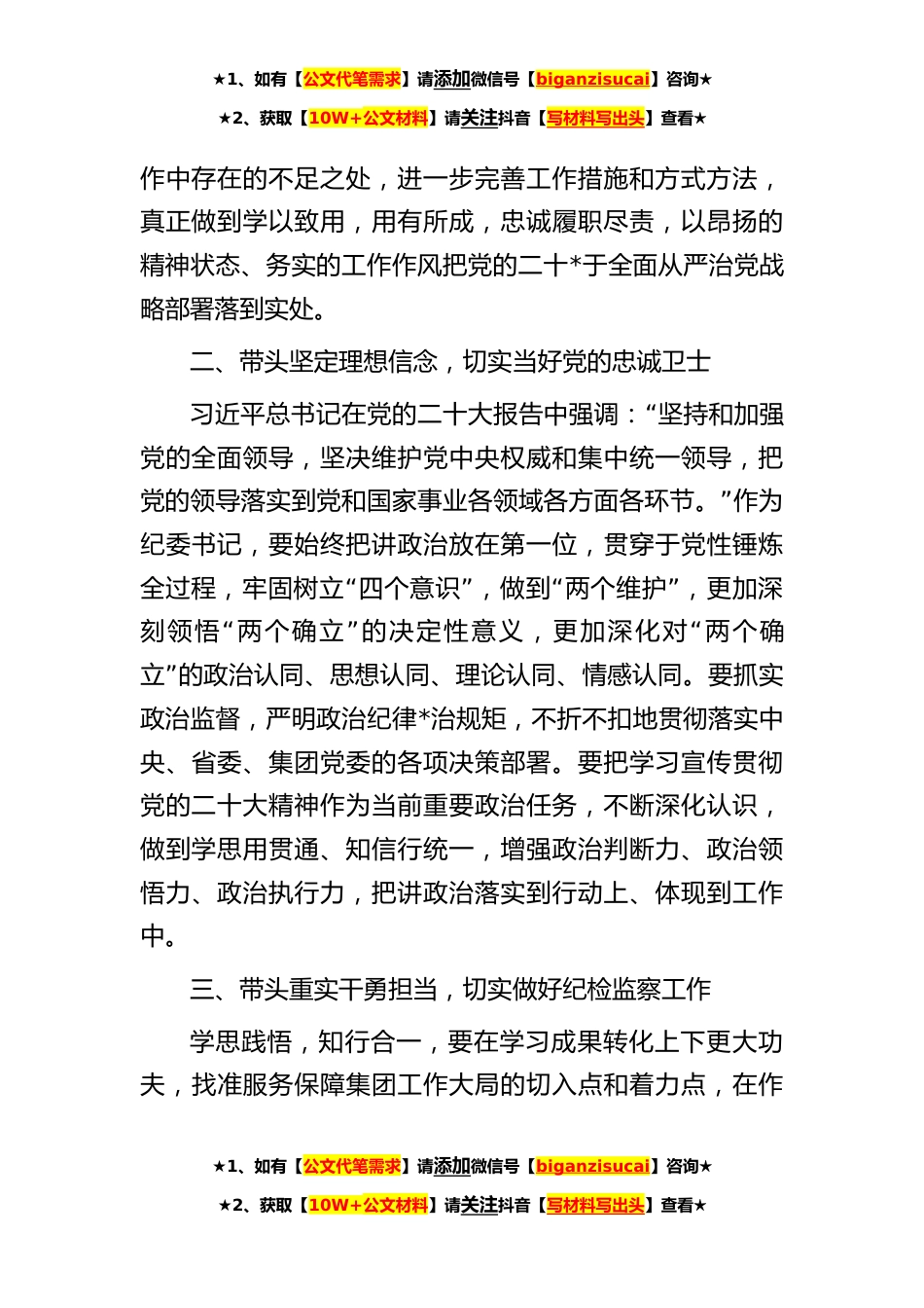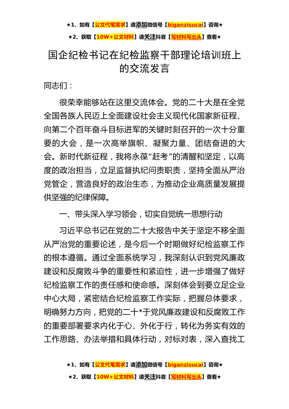 ★1、如有【公文代笔需求】请添加微信号【biganzisucai】咨询★★2、获取【10W+公文材料】请关注抖音【写材料写出头】查看★国企纪检书记在纪检监察干部理论培训班上的交流发言同志们:很荣幸能够站在这里交流体会。党的二十大是在全党全国各族人民迈上全面建设社会主义现代化国家新征程、向第二个百年奋斗目标进军的关键时刻召开的一次十分重要的大会,是一次高举旗帜、凝聚力量、团结奋进的大“”会。新时代新征程,我将永葆赶考的清醒和坚定,以高度的政治担当,立足监督执纪问责职责,坚持全面从严治党管企,营造良好的政治生态,为推动企业高质量发展提供坚强的纪律保障。一、带头深入学习领会,切实自觉统一思想行动习近平总书记在党的二十大报告中关于坚定不移全面从严治党的重要论述,是今后一个时期做好...