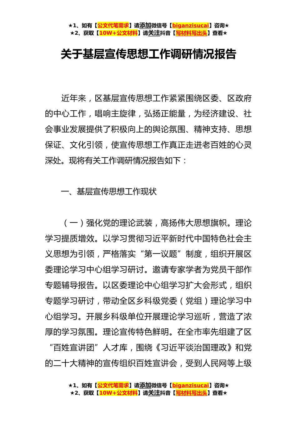 ★1、如有【公文代笔需求】请添加微信号【biganzisucai】咨询★★2、获取【10W+公文材料】请关注抖音【写材料写出头】查看★关于基层宣传思想工作调研情况报告近年来,区基层宣传思想工作紧紧围绕区委、区政府的中心工作,唱响主旋律,弘扬正能量,为经济建设、社会事业发展提供了积极向上的舆论氛围、精神支持、思想保证、文化引领,使宣传思想工作真正走进老百姓的心灵深处。现将有关工作调研情况报告如下:一、基层宣传思想工作现状(一)强化党的理论武装,高扬伟大思想旗帜。理论学习提质增效。以学习贯彻习近平新时代中国特色社会主义思想为引领,严格落实“第一议题”制度,组织开展区委理论学习中心组学习研讨。邀请专家学者为党员干部作专题辅导报告。以区委理论中心组学习扩大会形式,组织专题学习研讨...