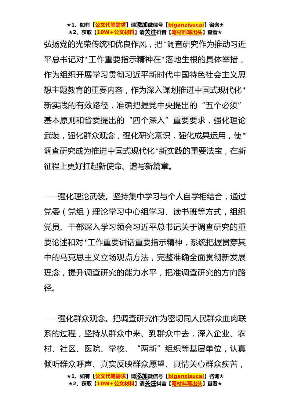 ★1、如有【公文代笔需求】请添加微信号【biganzisucai】咨询★★2、获取【10W+公文材料】请关注抖音【写材料写出头】查看★关于在全市各级党组织和广大党员干部中*调查研究的实施方案为深入学习贯彻习近平新时代中国特色社会主义思想,全面贯彻党中央关于在全党*调查研究的重要部署,动员组织全市各级党组织和广大党员干部广泛深入调查研究,更好落实党的二十大精神和习近平总书记对*工作重要讲话重要指示精神,推动中国式现代化*新实践开好局起好步,根据《中共中央办公厅印发〈关于在全党*调查研究的工作方案〉的通知》和《中共*省委办公厅印发〈关于在全省各级党组织和广大党员干部中*调查研究的实施方案〉的通知》要求,紧密结合*实际,制定本实施方案。一、总体要求坚持以习近平新时代中国特色社会主义思想...