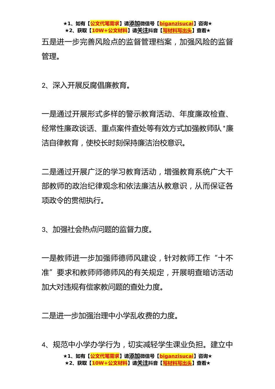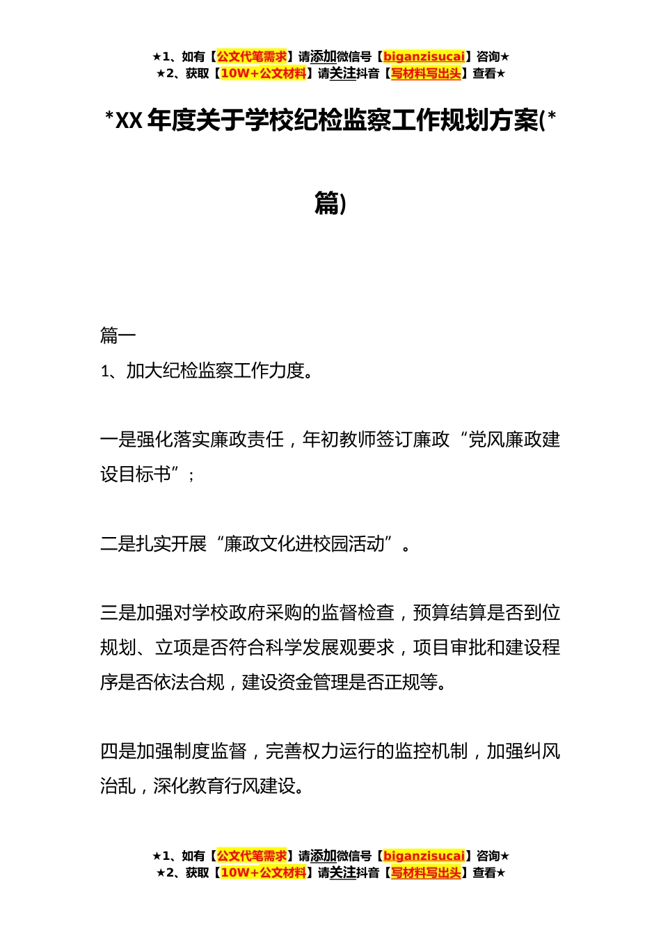 ★1、如有【公文代笔需求】请添加微信号【biganzisucai】咨询★★2、获取【10W+公文材料】请关注抖音【写材料写出头】查看★*XX年度关于学校纪检监察工作规划方案(*篇)篇一1、加大纪检监察工作力度。一是强化落实廉政责任,年初教师签订廉政“党风廉政建设目标书”;二是扎实开展“廉政文化进校园活动”。三是加强对学校政府采购的监督检查,预算结算是否到位规划、立项是否符合科学发展观要求,项目审批和建设程序是否依法合规,建设资金管理是否正规等。四是加强制度监督,完善权力运行的监控机制,加强纠风治乱,深化教育行风建设。★1、如有【公文代笔需求】请添加微信号【biganzisucai】咨询★★2、获取【10W+公文材料】请关注抖音【写材料写出头】查看★★1、如有【公文代笔需求】请添加微信号【biganzisucai...