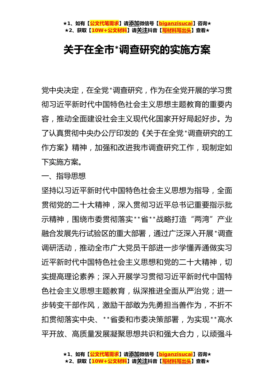 ★1、如有【公文代笔需求】请添加微信号【biganzisucai】咨询★★2、获取【10W+公文材料】请关注抖音【写材料写出头】查看★关于在全市*调查研究的实施方案党中央决定,在全党*调查研究,作为在全党开展的学习贯彻习近平新时代中国特色社会主义思想主题教育的重要内容,推动全面建设社会主义现代化国家开好局起好步。为了认真贯彻中央办公厅印发的《关于在全党*调查研究的工作方案》精神,加强和改进我市调查研究工作,现制定如下实施方案。一、指导思想坚持以习近平新时代中国特色社会主义思想为指导,全面贯彻党的二十大精神,深入贯彻习近平总书记重要指示批示精神,围绕市委贯彻落实**省**战略打造“两湾”产业融合发展先行试验区的重大部署,通过广泛深入开展*调查调研活动,推动全市广大党员干部进一步学懂...