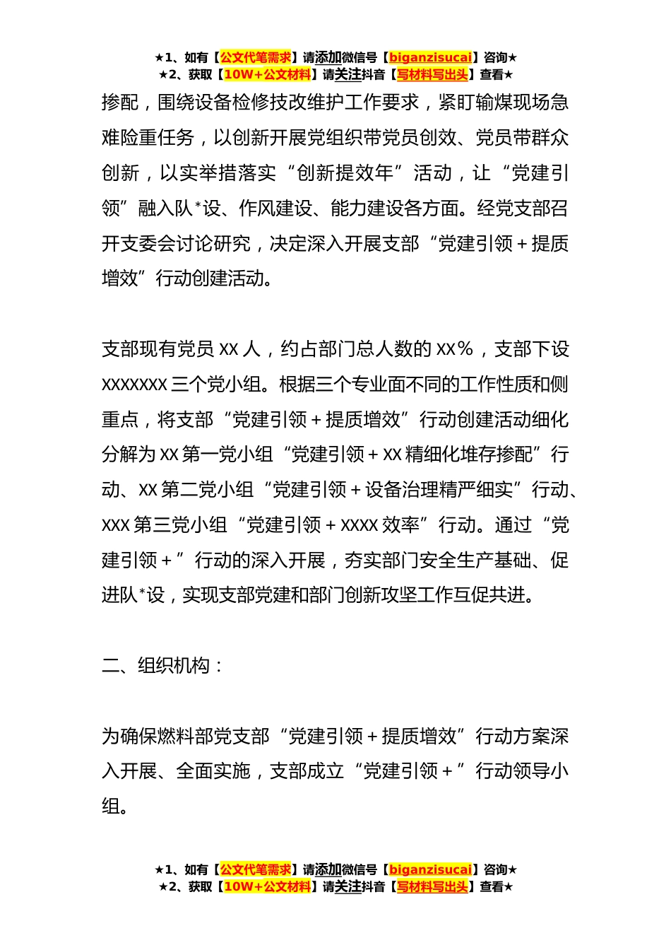 ★1、如有【公文代笔需求】请添加微信号【biganzisucai】咨询★★2、获取【10W+公文材料】请关注抖音【写材料写出头】查看★**年某党支部“党建引领+提质增效”行动实施方案**年是全面贯彻落实党的XX大精神的开局之年,按照公司**年党的建设工作重点任务和“党建引领提质年”专项行动实施方案,为持续丰富党建工作与中心工作的融合载体,以人才构筑坚强的支部堡垒,推动“一个支部一个品牌”建设,彰显党建工作的引领和保障作用,燃料部党支部以“创新提效年”活动为抓手,将党建工作与创新提效工作相融合,确保支部党建工作有新提高、新举措、新作为、新业绩。为使“党建引领+”行动深入开展,燃料部党支部制定本实施方案。一、实施目标:XXX党支部按照公司党委“党建引领+”行动方案中“一支部一品牌一特色”...