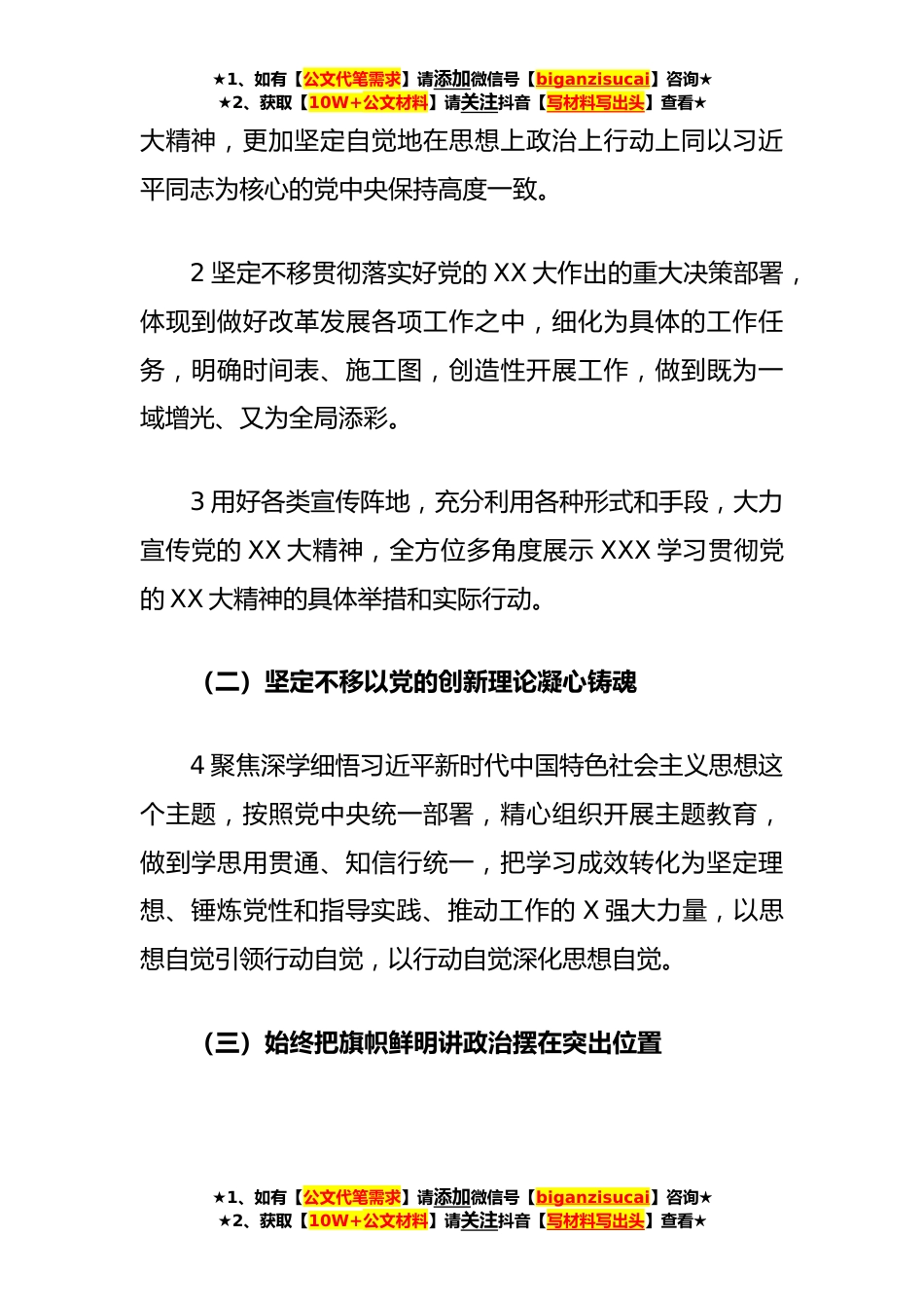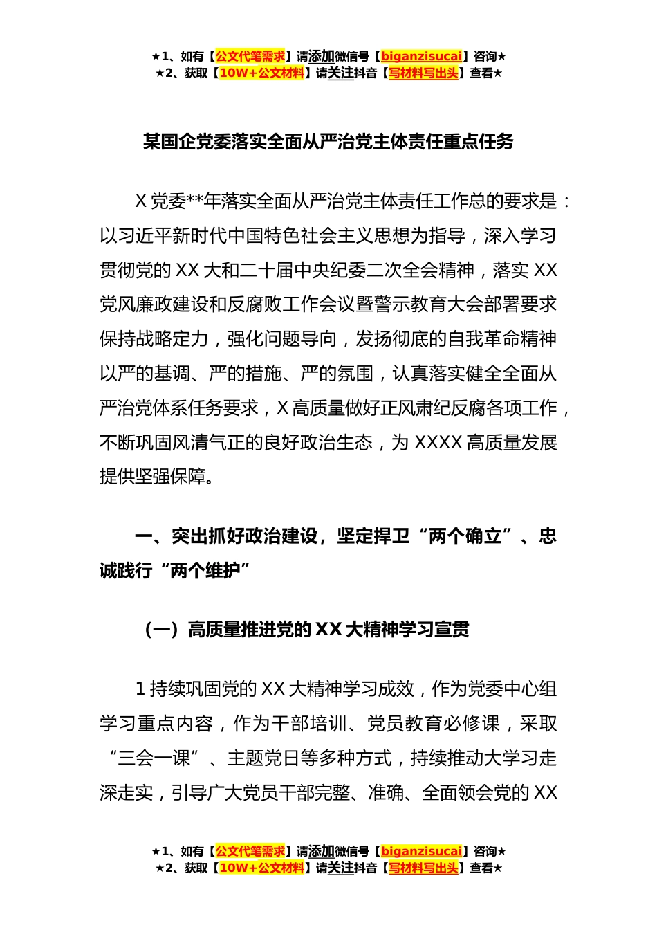 ★1、如有【公文代笔需求】请添加微信号【biganzisucai】咨询★★2、获取【10W+公文材料】请关注抖音【写材料写出头】查看★某国企党委落实全面从严治党主体责任重点任务X党委**年落实全面从严治党主体责任工作总的要求是:以习近平新时代中国特色社会主义思想为指导,深入学习贯彻党的XX大和二十届中央纪委二次全会精神,落实XX党风廉政建设和反腐败工作会议暨警示教育大会部署要求保持战略定力,强化问题导向,发扬彻底的自我革命精神以严的基调、严的措施、严的氛围,认真落实健全全面从严治党体系任务要求,X高质量做好正风肃纪反腐各项工作,不断巩固风清气正的良好政治生态,为XXXX高质量发展提供坚强保障。一、突出抓好政治建设,坚定捍卫“两个确立”、忠诚践行“两个维护”(一)高质量推进党的XX大精神...