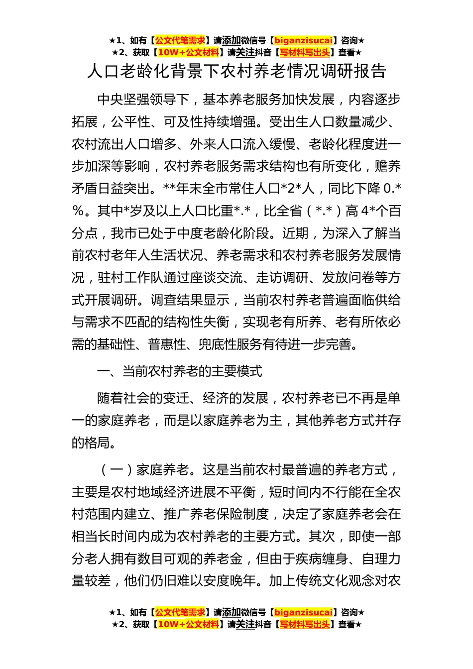 ★1、如有【公文代笔需求】请添加微信号【biganzisucai】咨询★★2、获取【10W+公文材料】请关注抖音【写材料写出头】查看★★1、如有【公文代笔需求】请添加微信号【biganzisucai】咨询★★2、获取【10W+公文材料】请关注抖音【写材料写出头】查看★★1、如有【公文代笔需求】请添加微信号【biganzisucai】咨询★★2、获取【10W+公文材料】请关注抖音【写材料写出头】查看★人口老龄化背景下农村养老情况调研报告中央坚强领导下,基本养老服务加快发展,内容逐步拓展,公平性、可及性持续增强。受出生人口数量减少、农村流出人口增多、外来人口流入缓慢、老龄化程度进一步加深等影响,农村养老服务需求结构也有所变化,赡养矛盾日益突出。**年末全市常住人口*2*人,同比下降0.*%。其中*岁及以上人口比重*.*,比...