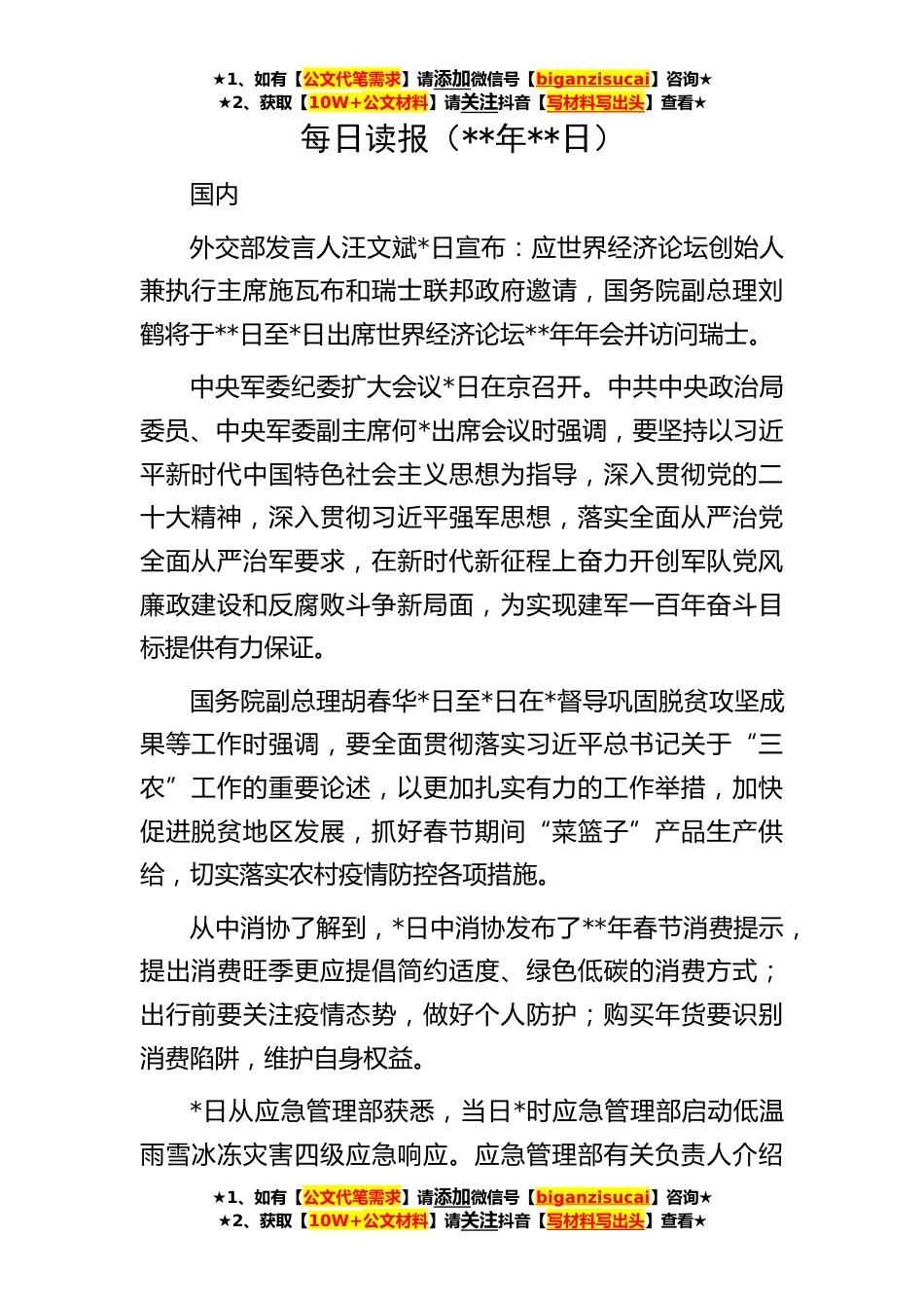 ★1、如有【公文代笔需求】请添加微信号【biganzisucai】咨询★★2、获取【10W+公文材料】请关注抖音【写材料写出头】查看★★1、如有【公文代笔需求】请添加微信号【biganzisucai】咨询★★2、获取【10W+公文材料】请关注抖音【写材料写出头】查看★★1、如有【公文代笔需求】请添加微信号【biganzisucai】咨询★★2、获取【10W+公文材料】请关注抖音【写材料写出头】查看★每日读报(**年**日)国内外交部发言人汪文斌*日宣布:应世界经济论坛创始人兼执行主席施瓦布和瑞士联邦政府邀请,国务院副总理刘鹤将于**日至*日出席世界经济论坛**年年会并访问瑞士。中央军委纪委扩大会议*日在京召开。中共中央政治局委员、中央军委副主席何*出席会议时强调,要坚持以习近平新时代中国特色社会主义思想为指导,深入贯彻...