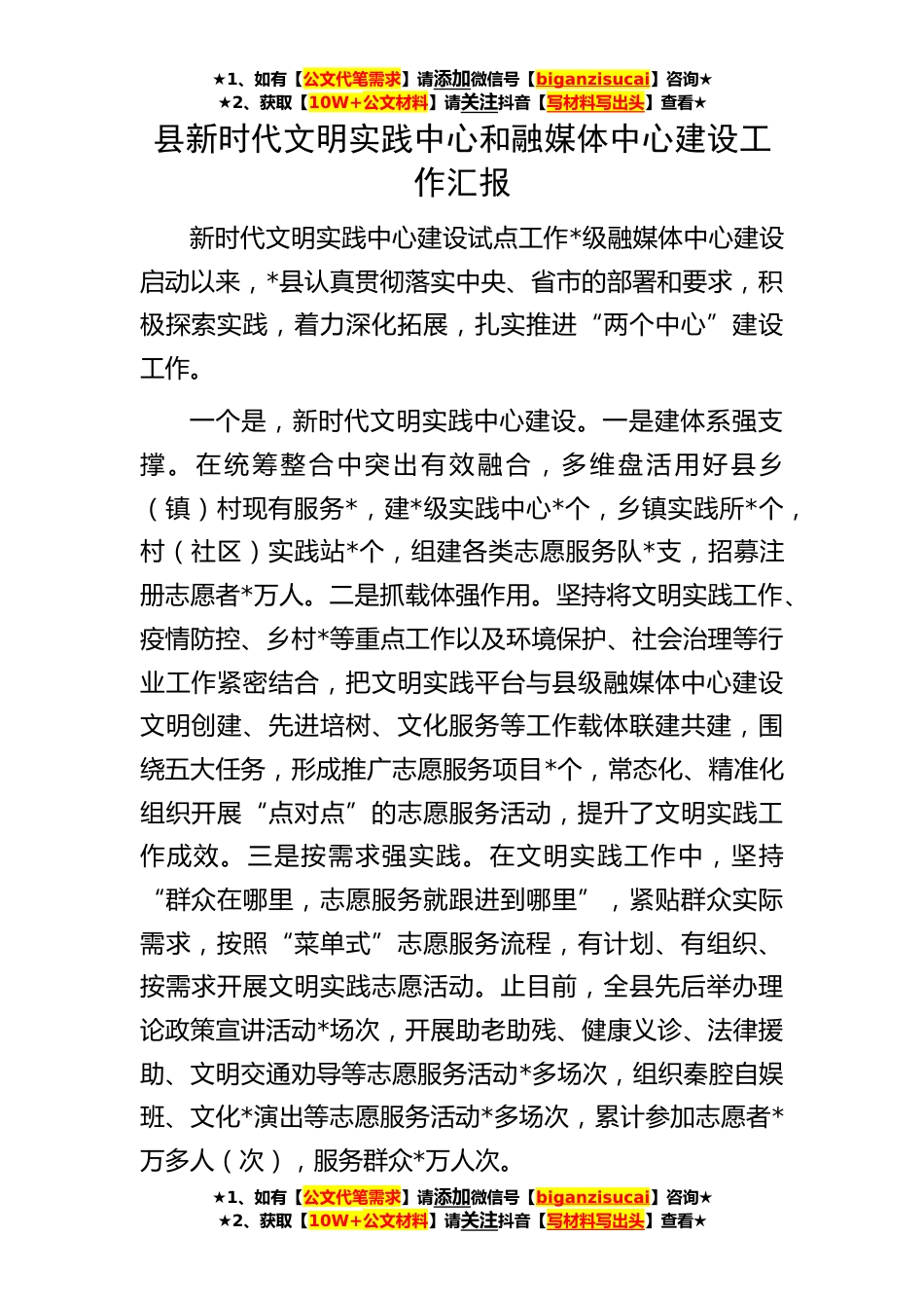 ★1、如有【公文代笔需求】请添加微信号【biganzisucai】咨询★★2、获取【10W+公文材料】请关注抖音【写材料写出头】查看★★1、如有【公文代笔需求】请添加微信号【biganzisucai】咨询★★2、获取【10W+公文材料】请关注抖音【写材料写出头】查看★★1、如有【公文代笔需求】请添加微信号【biganzisucai】咨询★★2、获取【10W+公文材料】请关注抖音【写材料写出头】查看★县新时代文明实践中心和融媒体中心建设工作汇报新时代文明实践中心建设试点工作*级融媒体中心建设启动以来,*县认真贯彻落实中央、省市的部署和要求,积极探索实践,着力深化拓展,扎实推进“两个中心”建设工作。一个是,新时代文明实践中心建设。一是建体系强支撑。在统筹整合中突出有效融合,多维盘活用好县乡(镇)村现有服务*,建*级...