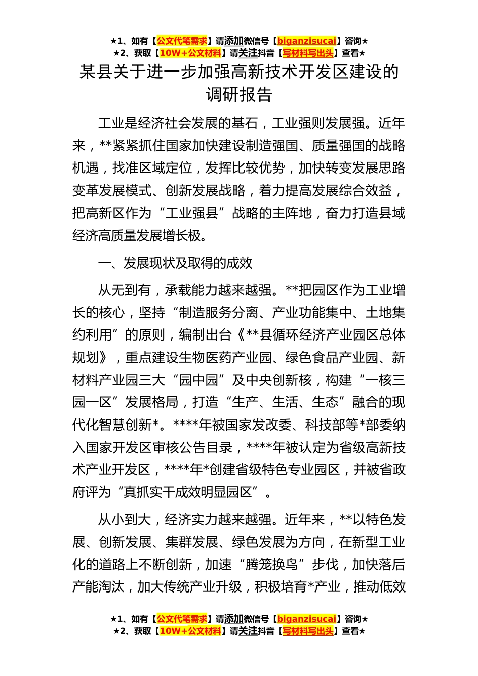 ★1、如有【公文代笔需求】请添加微信号【biganzisucai】咨询★★2、获取【10W+公文材料】请关注抖音【写材料写出头】查看★★1、如有【公文代笔需求】请添加微信号【biganzisucai】咨询★★2、获取【10W+公文材料】请关注抖音【写材料写出头】查看★★1、如有【公文代笔需求】请添加微信号【biganzisucai】咨询★★2、获取【10W+公文材料】请关注抖音【写材料写出头】查看★某县关于进一步加强高新技术开发区建设的调研报告工业是经济社会发展的基石,工业强则发展强。近年来,**紧紧抓住国家加快建设制造强国、质量强国的战略机遇,找准区域定位,发挥比较优势,加快转变发展思路变革发展模式、创新发展战略,着力提高发展综合效益,把高新区作为“工业强县”战略的主阵地,奋力打造县域经济高质量发展增长极。...