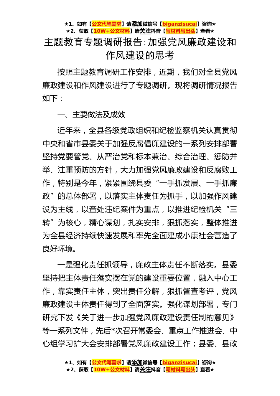 ★1、如有【公文代笔需求】请添加微信号【biganzisucai】咨询★★2、获取【10W+公文材料】请关注抖音【写材料写出头】查看★★1、如有【公文代笔需求】请添加微信号【biganzisucai】咨询★★2、获取【10W+公文材料】请关注抖音【写材料写出头】查看★★1、如有【公文代笔需求】请添加微信号【biganzisucai】咨询★★2、获取【10W+公文材料】请关注抖音【写材料写出头】查看★主题教育专题调研报告:加强党风廉政建设和作风建设的思考按照主题教育调研工作安排,近期,我们对全县党风廉政建设和作风建设进行了专题调研。现将调研情况报告如下:一、主要做法及成效近年来,全县各级党政组织和纪检监察机关认真贯彻中央和省市县委关于加强反腐倡廉建设的一系列安排部署坚持党要管党、从严治党和标本兼治、综合治理、惩...