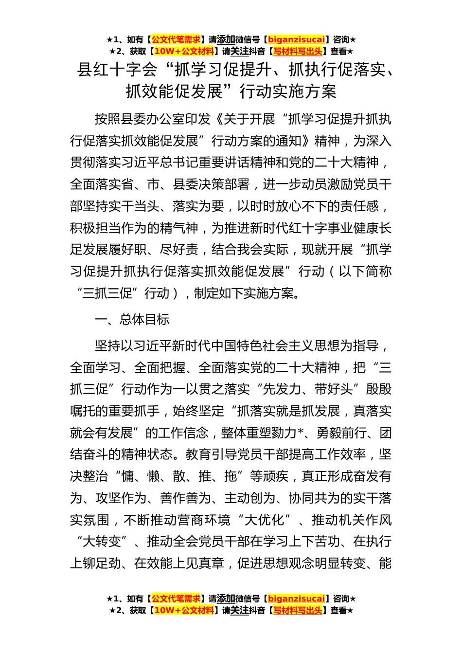 ★1、如有【公文代笔需求】请添加微信号【biganzisucai】咨询★★2、获取【10W+公文材料】请关注抖音【写材料写出头】查看★★1、如有【公文代笔需求】请添加微信号【biganzisucai】咨询★★2、获取【10W+公文材料】请关注抖音【写材料写出头】查看★★1、如有【公文代笔需求】请添加微信号【biganzisucai】咨询★★2、获取【10W+公文材料】请关注抖音【写材料写出头】查看★县红十字会“抓学习促提升、抓执行促落实、抓效能促发展”行动实施方案按照县委办公室印发《关于开展“抓学习促提升抓执行促落实抓效能促发展”行动方案的通知》精神,为深入贯彻落实习近平总书记重要讲话精神和党的二十大精神,全面落实省、市、县委决策部署,进一步动员激励党员干部坚持实干当头、落实为要,以时时放心不下的责任感,积...