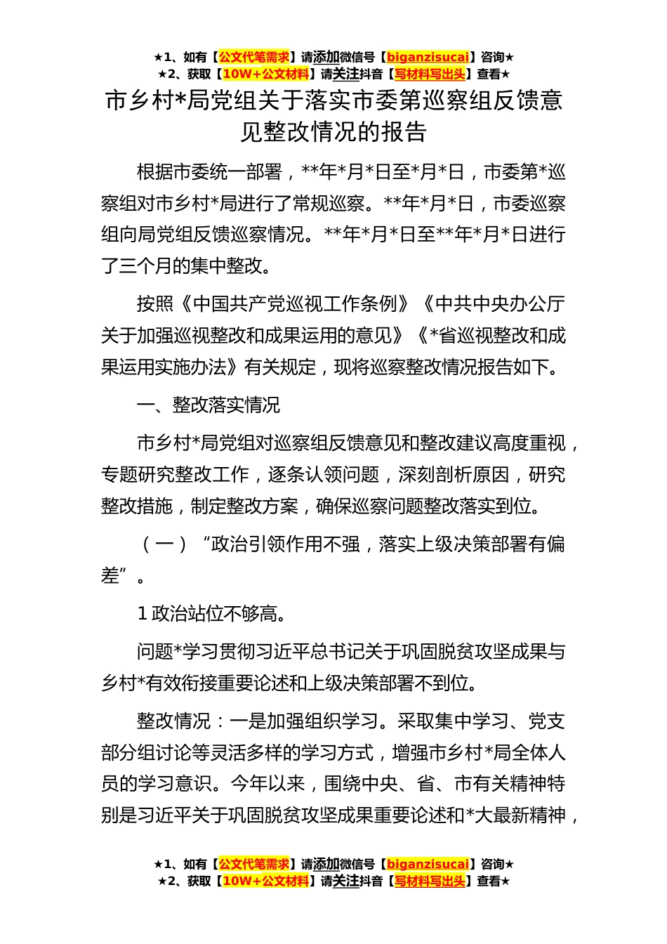 ★1、如有【公文代笔需求】请添加微信号【biganzisucai】咨询★★2、获取【10W+公文材料】请关注抖音【写材料写出头】查看★★1、如有【公文代笔需求】请添加微信号【biganzisucai】咨询★★2、获取【10W+公文材料】请关注抖音【写材料写出头】查看★★1、如有【公文代笔需求】请添加微信号【biganzisucai】咨询★★2、获取【10W+公文材料】请关注抖音【写材料写出头】查看★市乡村*局党组关于落实市委第巡察组反馈意见整改情况的报告根据市委统一部署,**年*月*日至*月*日,市委第*巡察组对市乡村*局进行了常规巡察。**年*月*日,市委巡察组向局党组反馈巡察情况。**年*月*日至**年*月*日进行了三个月的集中整改。按照《中国共产党巡视工作条例》《中共中央办公厅关于加强巡视整改和成果运用的意见》《*省巡视整...