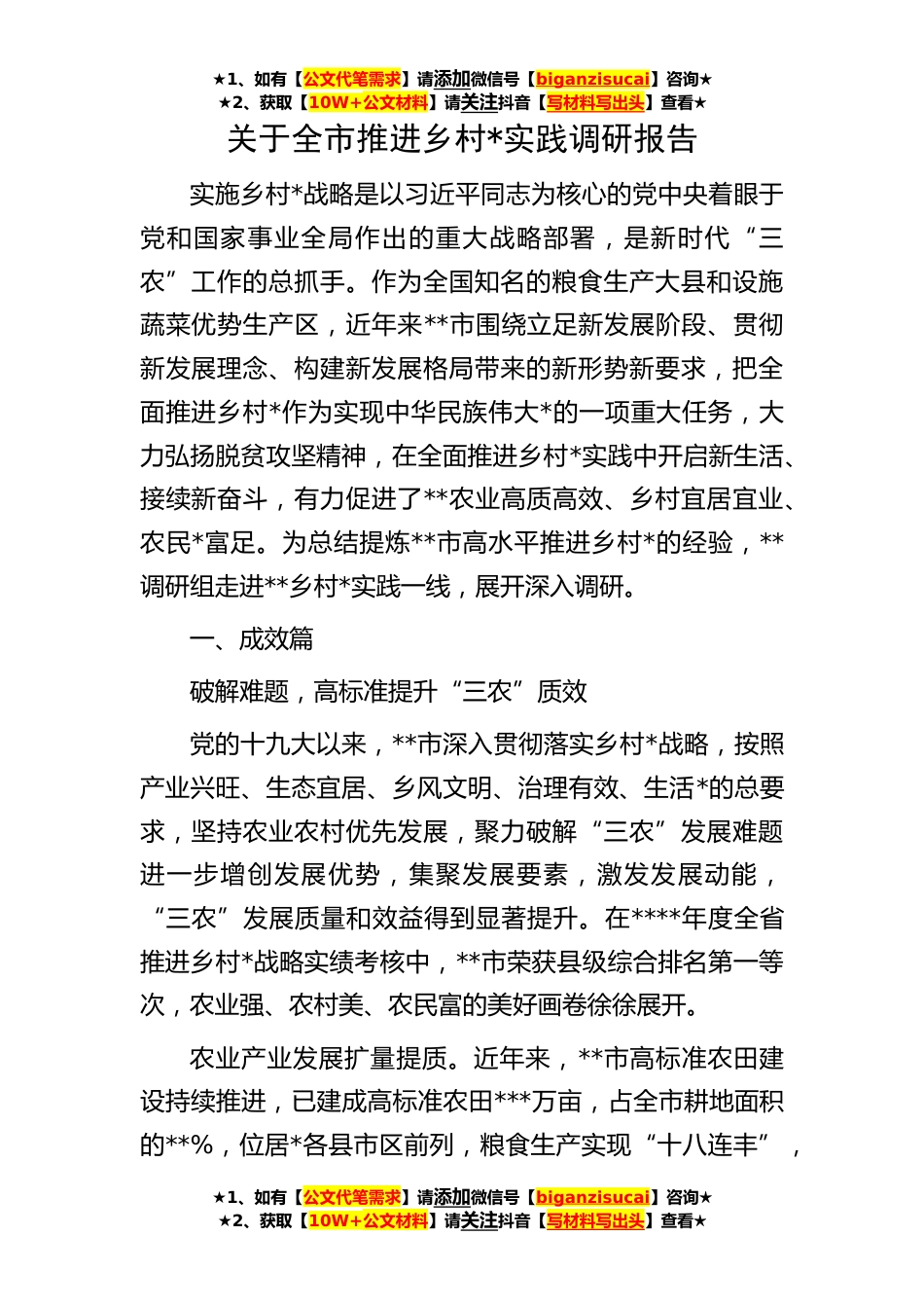 ★1、如有【公文代笔需求】请添加微信号【biganzisucai】咨询★★2、获取【10W+公文材料】请关注抖音【写材料写出头】查看★★1、如有【公文代笔需求】请添加微信号【biganzisucai】咨询★★2、获取【10W+公文材料】请关注抖音【写材料写出头】查看★★1、如有【公文代笔需求】请添加微信号【biganzisucai】咨询★★2、获取【10W+公文材料】请关注抖音【写材料写出头】查看★关于全市推进乡村*实践调研报告实施乡村*战略是以习近平同志为核心的党中央着眼于党和国家事业全局作出的重大战略部署,是新时代“三农”工作的总抓手。作为全国知名的粮食生产大县和设施蔬菜优势生产区,近年来**市围绕立足新发展阶段、贯彻新发展理念、构建新发展格局带来的新形势新要求,把全面推进乡村*作为实现中华民族伟大*的一项重...