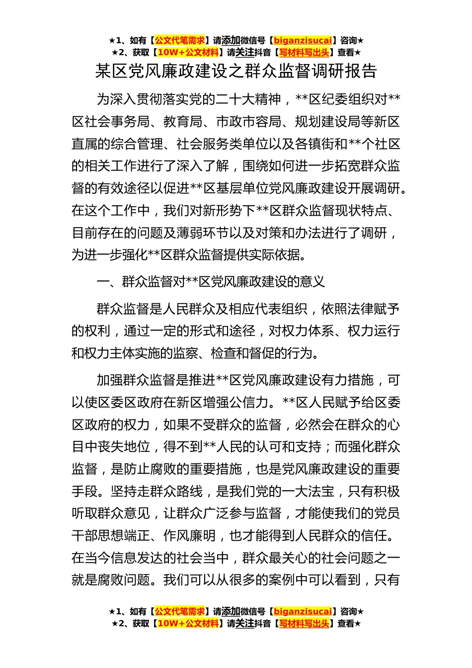 ★1、如有【公文代笔需求】请添加微信号【biganzisucai】咨询★★2、获取【10W+公文材料】请关注抖音【写材料写出头】查看★★1、如有【公文代笔需求】请添加微信号【biganzisucai】咨询★★2、获取【10W+公文材料】请关注抖音【写材料写出头】查看★★1、如有【公文代笔需求】请添加微信号【biganzisucai】咨询★★2、获取【10W+公文材料】请关注抖音【写材料写出头】查看★某区党风廉政建设之群众监督调研报告为深入贯彻落实党的二十大精神,**区纪委组织对**区社会事务局、教育局、市政市容局、规划建设局等新区直属的综合管理、社会服务类单位以及各镇街和**个社区的相关工作进行了深入了解,围绕如何进一步拓宽群众监督的有效途径以促进**区基层单位党风廉政建设开展调研。在这个工作中,我们对新形势下**区...
