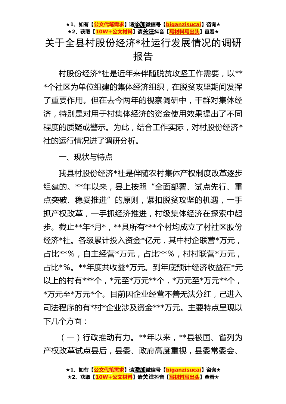 ★1、如有【公文代笔需求】请添加微信号【biganzisucai】咨询★★2、获取【10W+公文材料】请关注抖音【写材料写出头】查看★★1、如有【公文代笔需求】请添加微信号【biganzisucai】咨询★★2、获取【10W+公文材料】请关注抖音【写材料写出头】查看★★1、如有【公文代笔需求】请添加微信号【biganzisucai】咨询★★2、获取【10W+公文材料】请关注抖音【写材料写出头】查看★关于全县村股份经济*社运行发展情况的调研报告村股份经济*社是近年来伴随脱贫攻坚工作需要,以***个社区为单位组建的集体经济组织,在脱贫攻坚期间发挥了重要作用。但在去今两年的视察调研中,干群对集体经济,特别是对用于村集体经济的资金使用效果提出了不同程度的质疑或警示。为此,结合工作实际,对村股份经济*社的运行情况进了调研分...