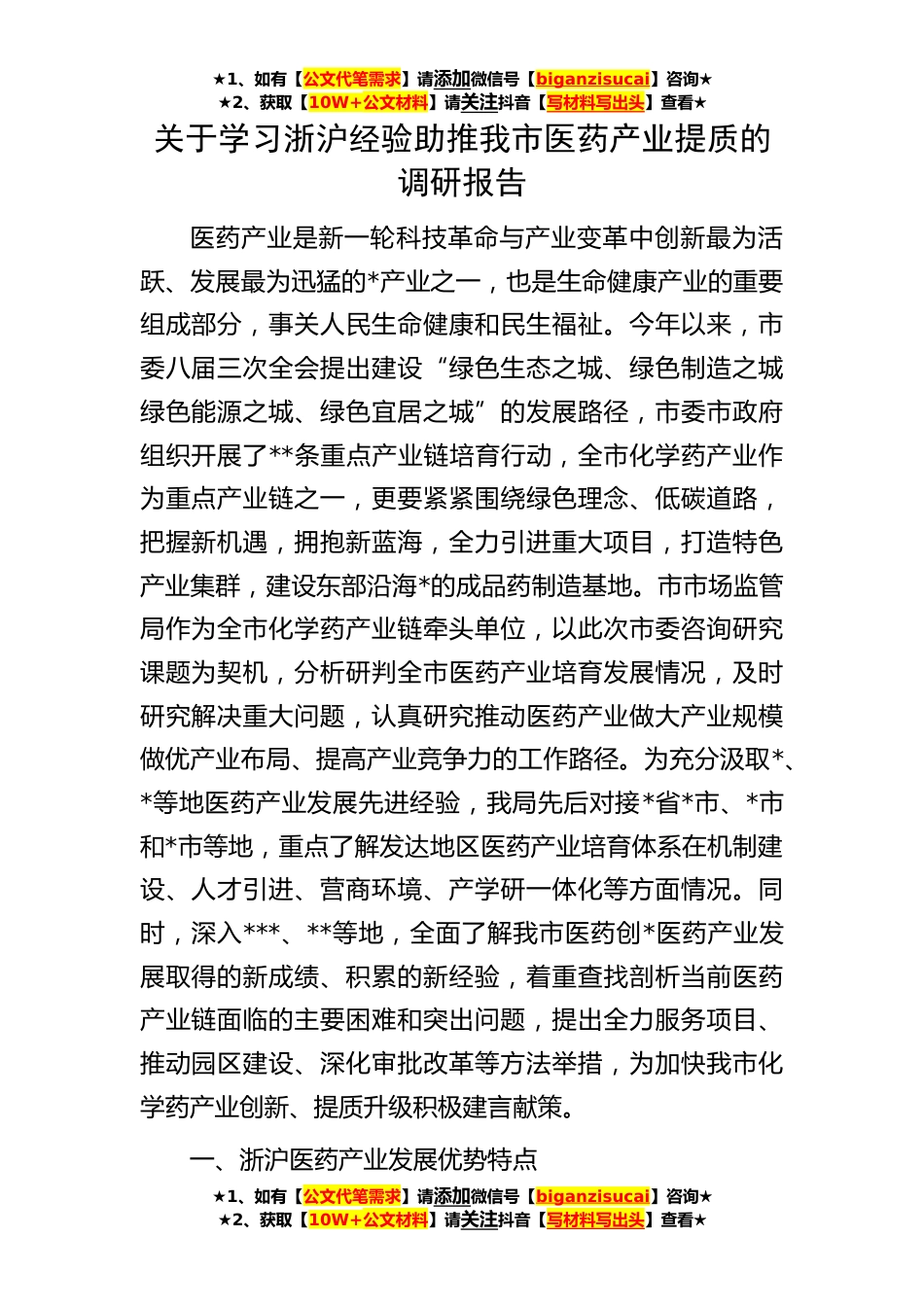 ★1、如有【公文代笔需求】请添加微信号【biganzisucai】咨询★★2、获取【10W+公文材料】请关注抖音【写材料写出头】查看★★1、如有【公文代笔需求】请添加微信号【biganzisucai】咨询★★2、获取【10W+公文材料】请关注抖音【写材料写出头】查看★★1、如有【公文代笔需求】请添加微信号【biganzisucai】咨询★★2、获取【10W+公文材料】请关注抖音【写材料写出头】查看★关于学习浙沪经验助推我市医药产业提质的调研报告医药产业是新一轮科技革命与产业变革中创新最为活跃、发展最为迅猛的*产业之一,也是生命健康产业的重要组成部分,事关人民生命健康和民生福祉。今年以来,市委八届三次全会提出建设“绿色生态之城、绿色制造之城绿色能源之城、绿色宜居之城”的发展路径,市委市政府组织开展了**条重点产业...