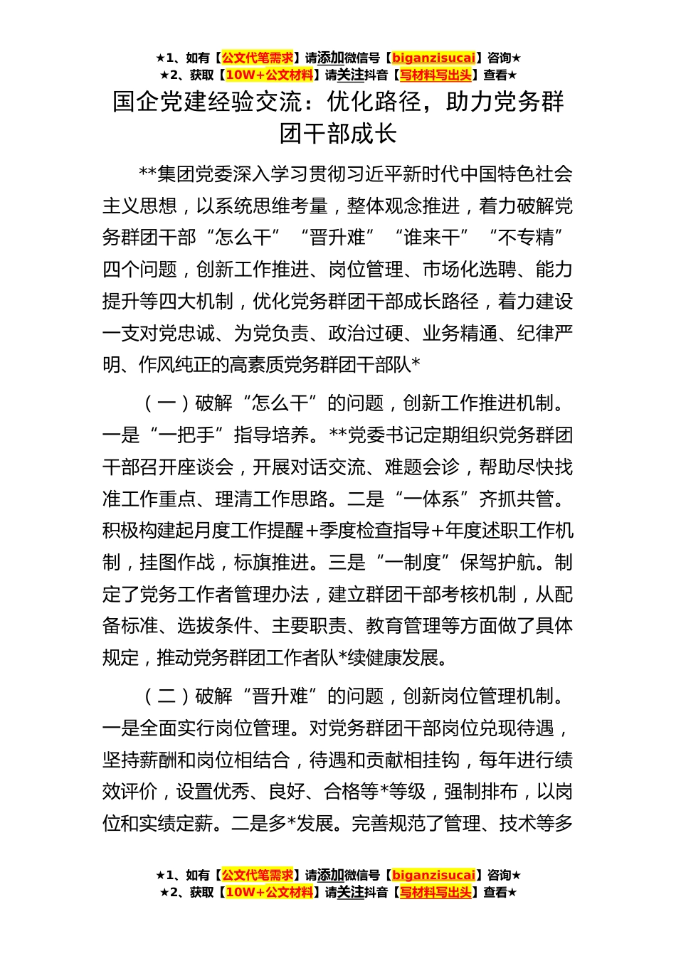 ★1、如有【公文代笔需求】请添加微信号【biganzisucai】咨询★★2、获取【10W+公文材料】请关注抖音【写材料写出头】查看★★1、如有【公文代笔需求】请添加微信号【biganzisucai】咨询★★2、获取【10W+公文材料】请关注抖音【写材料写出头】查看★★1、如有【公文代笔需求】请添加微信号【biganzisucai】咨询★★2、获取【10W+公文材料】请关注抖音【写材料写出头】查看★国企党建经验交流:优化路径,助力党务群团干部成长**集团党委深入学习贯彻习近平新时代中国特色社会主义思想,以系统思维考量,整体观念推进,着力破解党务群团干部“怎么干”“晋升难”“谁来干”“不专精”四个问题,创新工作推进、岗位管理、市场化选聘、能力提升等四大机制,优化党务群团干部成长路径,着力建设一支对党忠诚、为党负...