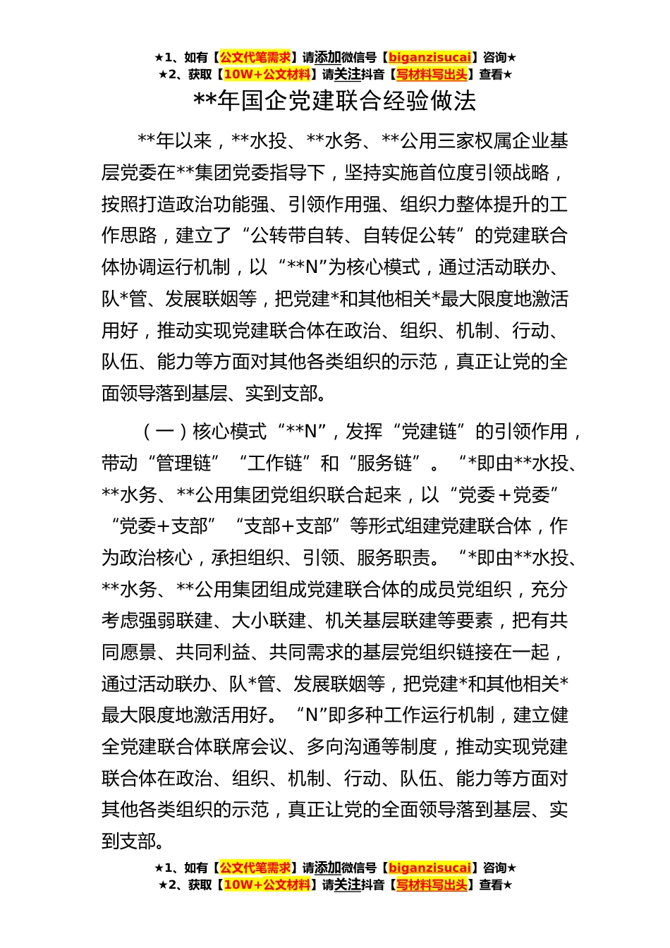 ★1、如有【公文代笔需求】请添加微信号【biganzisucai】咨询★★2、获取【10W+公文材料】请关注抖音【写材料写出头】查看★★1、如有【公文代笔需求】请添加微信号【biganzisucai】咨询★★2、获取【10W+公文材料】请关注抖音【写材料写出头】查看★★1、如有【公文代笔需求】请添加微信号【biganzisucai】咨询★★2、获取【10W+公文材料】请关注抖音【写材料写出头】查看★**年国企党建联合经验做法**年以来,**水投、**水务、**公用三家权属企业基层党委在**集团党委指导下,坚持实施首位度引领战略,按照打造政治功能强、引领作用强、组织力整体提升的工作思路,建立了“公转带自转、自转促公转”的党建联合体协调运行机制,以“**N”为核心模式,通过活动联办、队*管、发展联姻等,把党建*和其他相关*最大限...