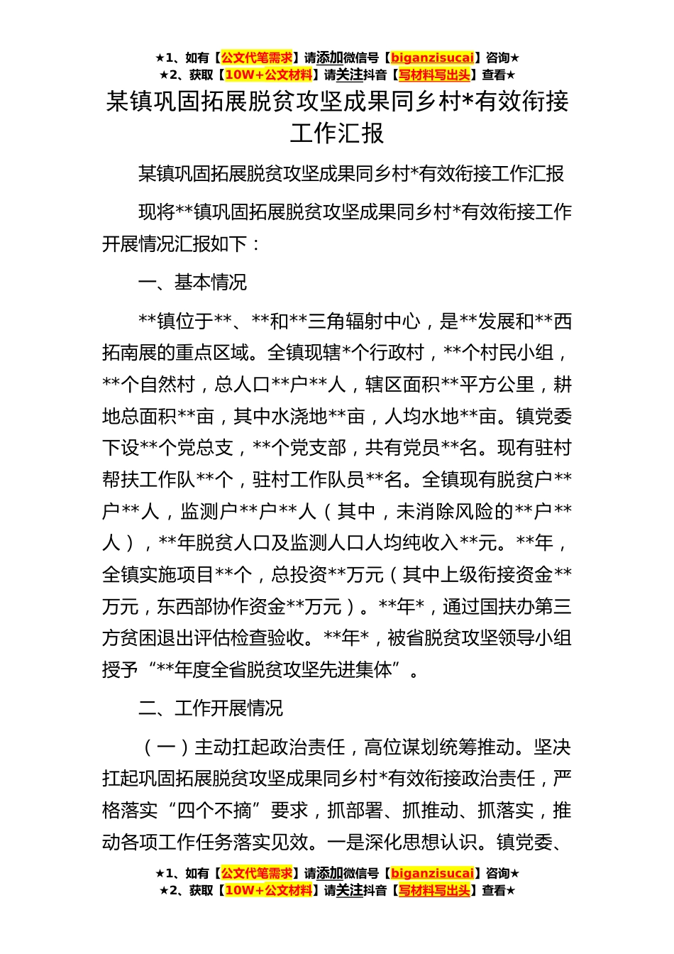 ★1、如有【公文代笔需求】请添加微信号【biganzisucai】咨询★★2、获取【10W+公文材料】请关注抖音【写材料写出头】查看★★1、如有【公文代笔需求】请添加微信号【biganzisucai】咨询★★2、获取【10W+公文材料】请关注抖音【写材料写出头】查看★★1、如有【公文代笔需求】请添加微信号【biganzisucai】咨询★★2、获取【10W+公文材料】请关注抖音【写材料写出头】查看★某镇巩固拓展脱贫攻坚成果同乡村*有效衔接工作汇报某镇巩固拓展脱贫攻坚成果同乡村*有效衔接工作汇报现将**镇巩固拓展脱贫攻坚成果同乡村*有效衔接工作开展情况汇报如下:一、基本情况**镇位于**、**和**三角辐射中心,是**发展和**西拓南展的重点区域。全镇现辖*个行政村,**个村民小组,**个自然村,总人口**户**人,辖区面积**平方公里...