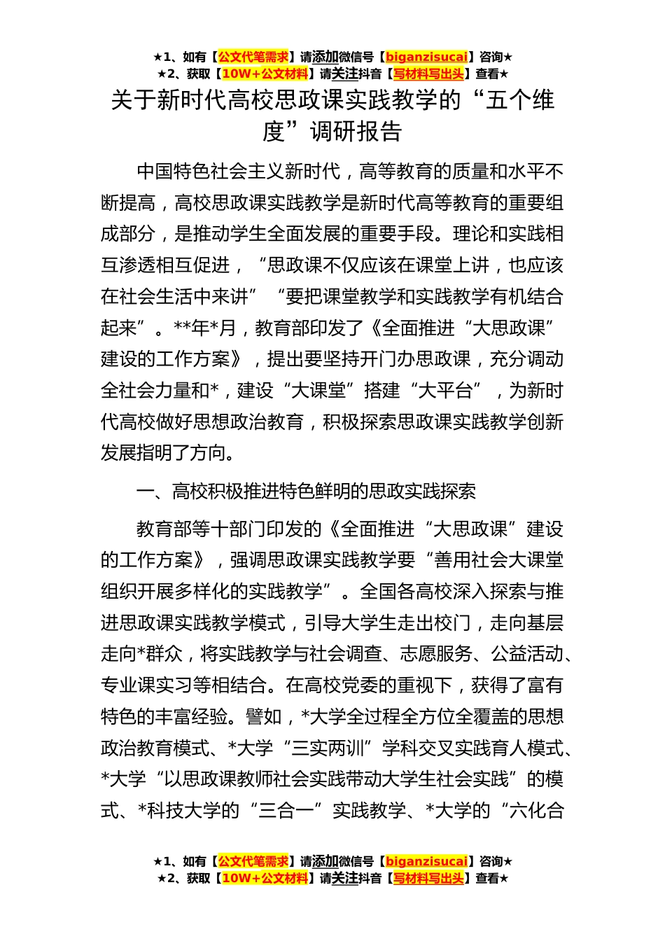 ★1、如有【公文代笔需求】请添加微信号【biganzisucai】咨询★★2、获取【10W+公文材料】请关注抖音【写材料写出头】查看★★1、如有【公文代笔需求】请添加微信号【biganzisucai】咨询★★2、获取【10W+公文材料】请关注抖音【写材料写出头】查看★★1、如有【公文代笔需求】请添加微信号【biganzisucai】咨询★★2、获取【10W+公文材料】请关注抖音【写材料写出头】查看★关于新时代高校思政课实践教学的“五个维度”调研报告中国特色社会主义新时代,高等教育的质量和水平不断提高,高校思政课实践教学是新时代高等教育的重要组成部分,是推动学生全面发展的重要手段。理论和实践相互渗透相互促进,“思政课不仅应该在课堂上讲,也应该在社会生活中来讲”“要把课堂教学和实践教学有机结合起来”。**年*月,教...