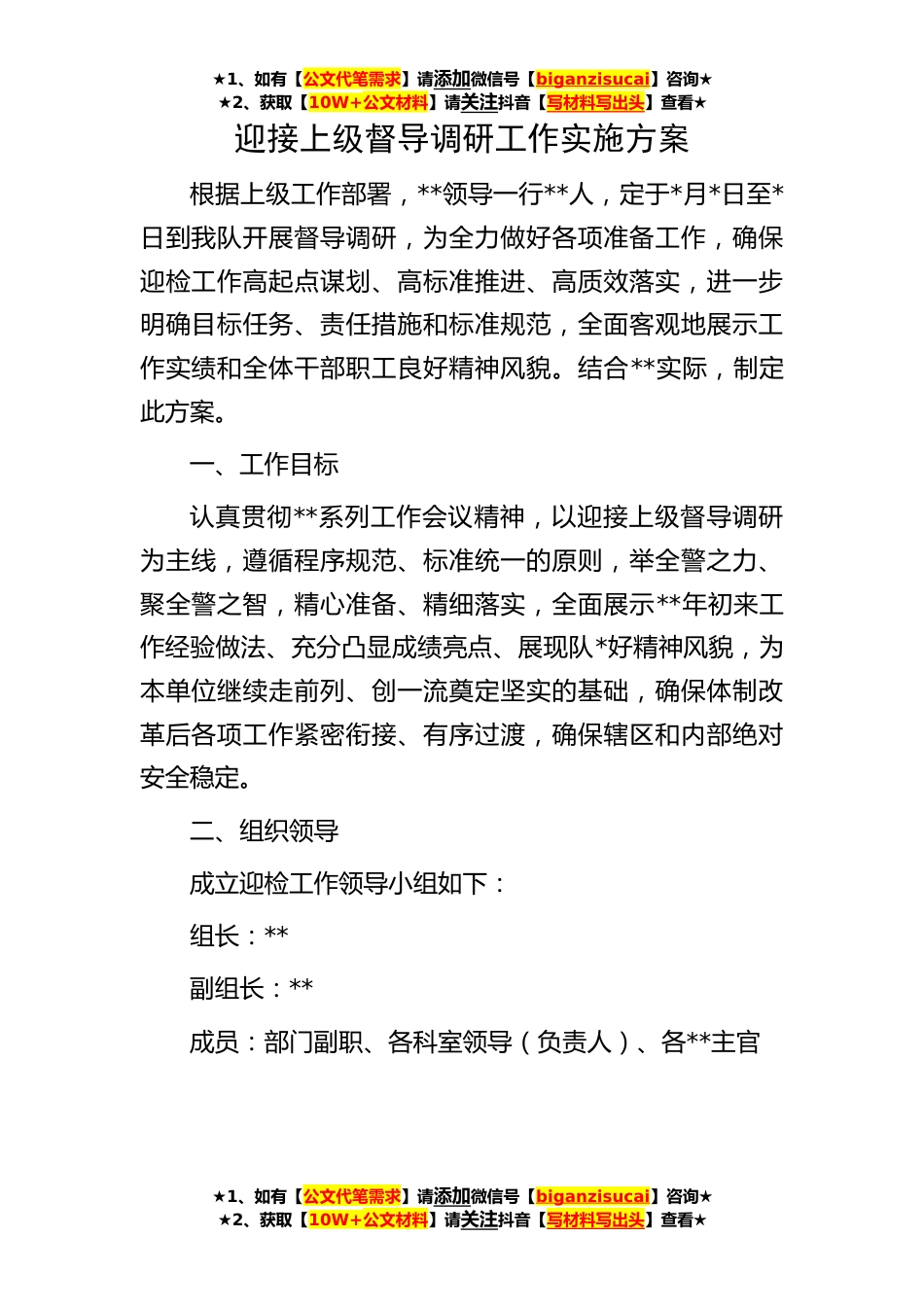 ★1、如有【公文代笔需求】请添加微信号【biganzisucai】咨询★★2、获取【10W+公文材料】请关注抖音【写材料写出头】查看★★1、如有【公文代笔需求】请添加微信号【biganzisucai】咨询★★2、获取【10W+公文材料】请关注抖音【写材料写出头】查看★★1、如有【公文代笔需求】请添加微信号【biganzisucai】咨询★★2、获取【10W+公文材料】请关注抖音【写材料写出头】查看★迎接上级督导调研工作实施方案根据上级工作部署,**领导一行**人,定于*月*日至*日到我队开展督导调研,为全力做好各项准备工作,确保迎检工作高起点谋划、高标准推进、高质效落实,进一步明确目标任务、责任措施和标准规范,全面客观地展示工作实绩和全体干部职工良好精神风貌。结合**实际,制定此方案。一、工作目标认真贯彻**系列工作会...