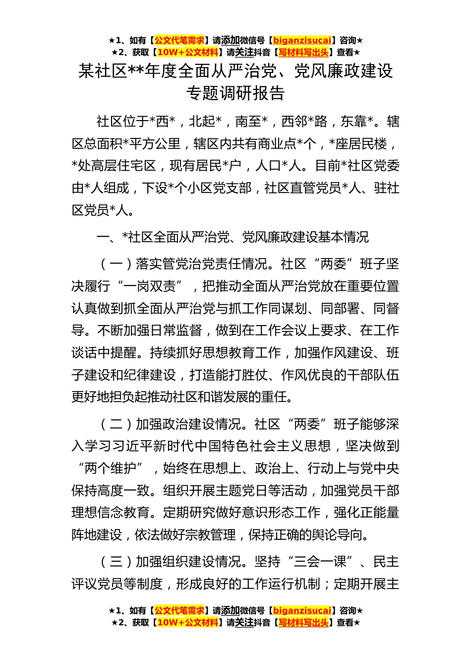★1、如有【公文代笔需求】请添加微信号【biganzisucai】咨询★★2、获取【10W+公文材料】请关注抖音【写材料写出头】查看★★1、如有【公文代笔需求】请添加微信号【biganzisucai】咨询★★2、获取【10W+公文材料】请关注抖音【写材料写出头】查看★★1、如有【公文代笔需求】请添加微信号【biganzisucai】咨询★★2、获取【10W+公文材料】请关注抖音【写材料写出头】查看★某社区**年度全面从严治党、党风廉政建设专题调研报告社区位于*西*,北起*,南至*,西邻*路,东靠*。辖区总面积*平方公里,辖区内共有商业点*个,*座居民楼,*处高层住宅区,现有居民*户,人口*人。目前*社区党委由*人组成,下设*个小区党支部,社区直管党员*人、驻社区党员*人。一、*社区全面从严治党、党风廉政建设基本情况(一)落实管...