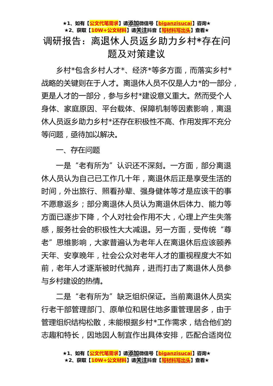 ★1、如有【公文代笔需求】请添加微信号【biganzisucai】咨询★★2、获取【10W+公文材料】请关注抖音【写材料写出头】查看★★1、如有【公文代笔需求】请添加微信号【biganzisucai】咨询★★2、获取【10W+公文材料】请关注抖音【写材料写出头】查看★★1、如有【公文代笔需求】请添加微信号【biganzisucai】咨询★★2、获取【10W+公文材料】请关注抖音【写材料写出头】查看★调研报告:离退休人员返乡助力乡村*存在问题及对策建议乡村*包含乡村人才*、经济*等多方面,而落实乡村*战略的关键则在于人才。离退休人员不仅是人力*的一部分,更是人才的一部分,参与乡村*建设意义重大。然而受个人身体、家庭原因、平台载体、保障机制等因素影响,离退休人员返乡助力乡村*还存在积极性不高、作用发挥不充分等问题,亟待...