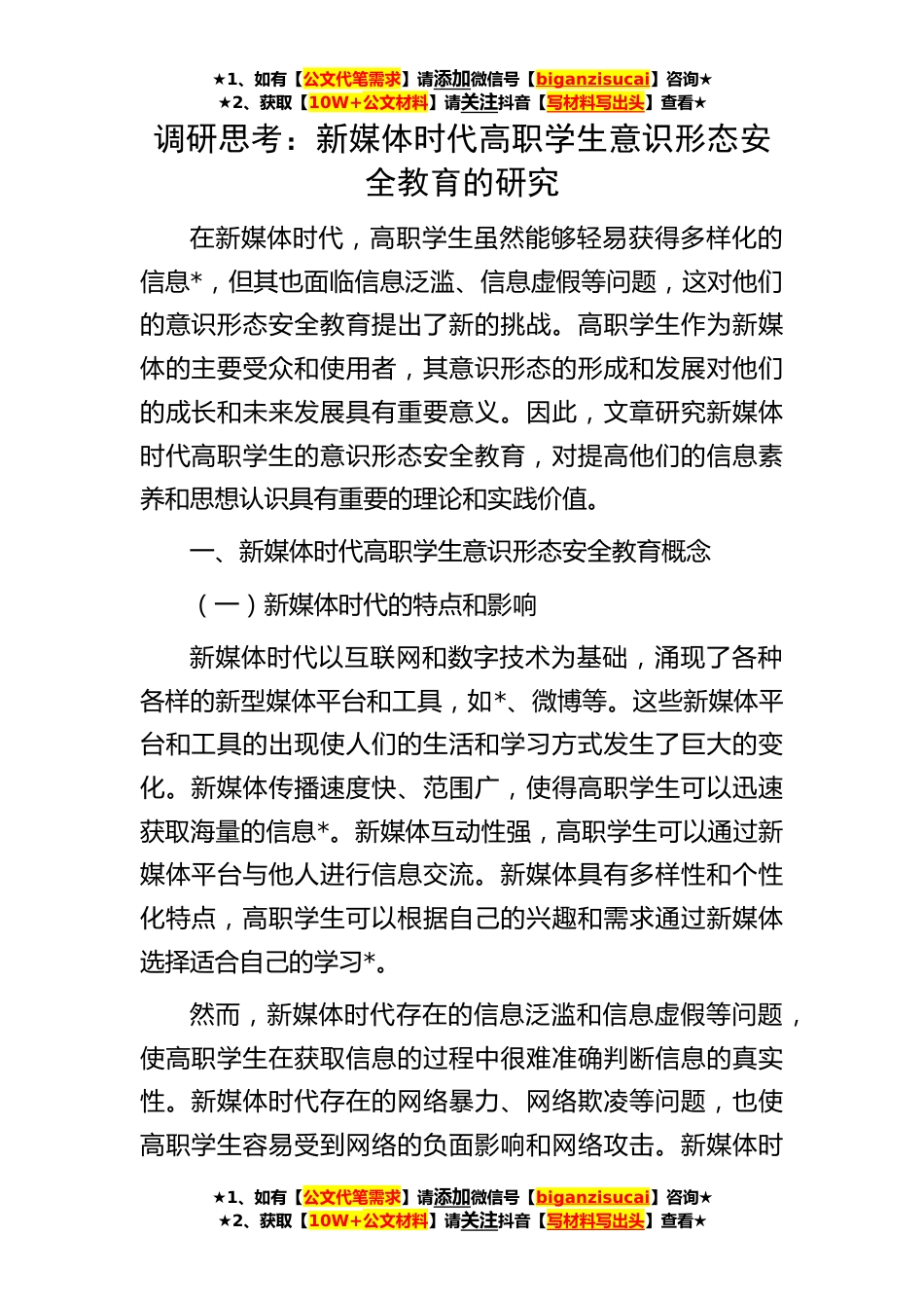 ★1、如有【公文代笔需求】请添加微信号【biganzisucai】咨询★★2、获取【10W+公文材料】请关注抖音【写材料写出头】查看★★1、如有【公文代笔需求】请添加微信号【biganzisucai】咨询★★2、获取【10W+公文材料】请关注抖音【写材料写出头】查看★★1、如有【公文代笔需求】请添加微信号【biganzisucai】咨询★★2、获取【10W+公文材料】请关注抖音【写材料写出头】查看★调研思考:新媒体时代高职学生意识形态安全教育的研究在新媒体时代,高职学生虽然能够轻易获得多样化的信息*,但其也面临信息泛滥、信息虚假等问题,这对他们的意识形态安全教育提出了新的挑战。高职学生作为新媒体的主要受众和使用者,其意识形态的形成和发展对他们的成长和未来发展具有重要意义。因此,文章研究新媒体时代高职学生的意识...