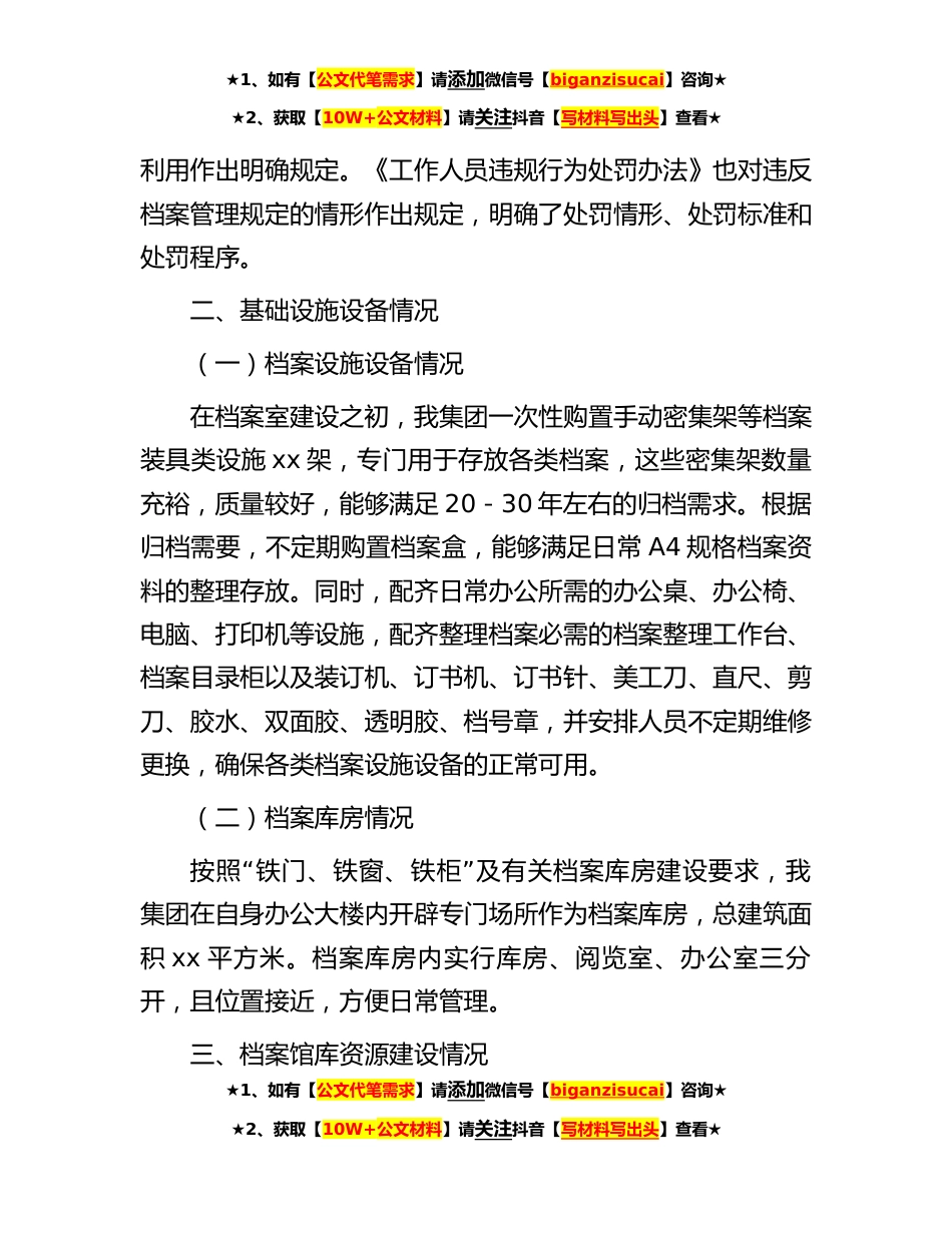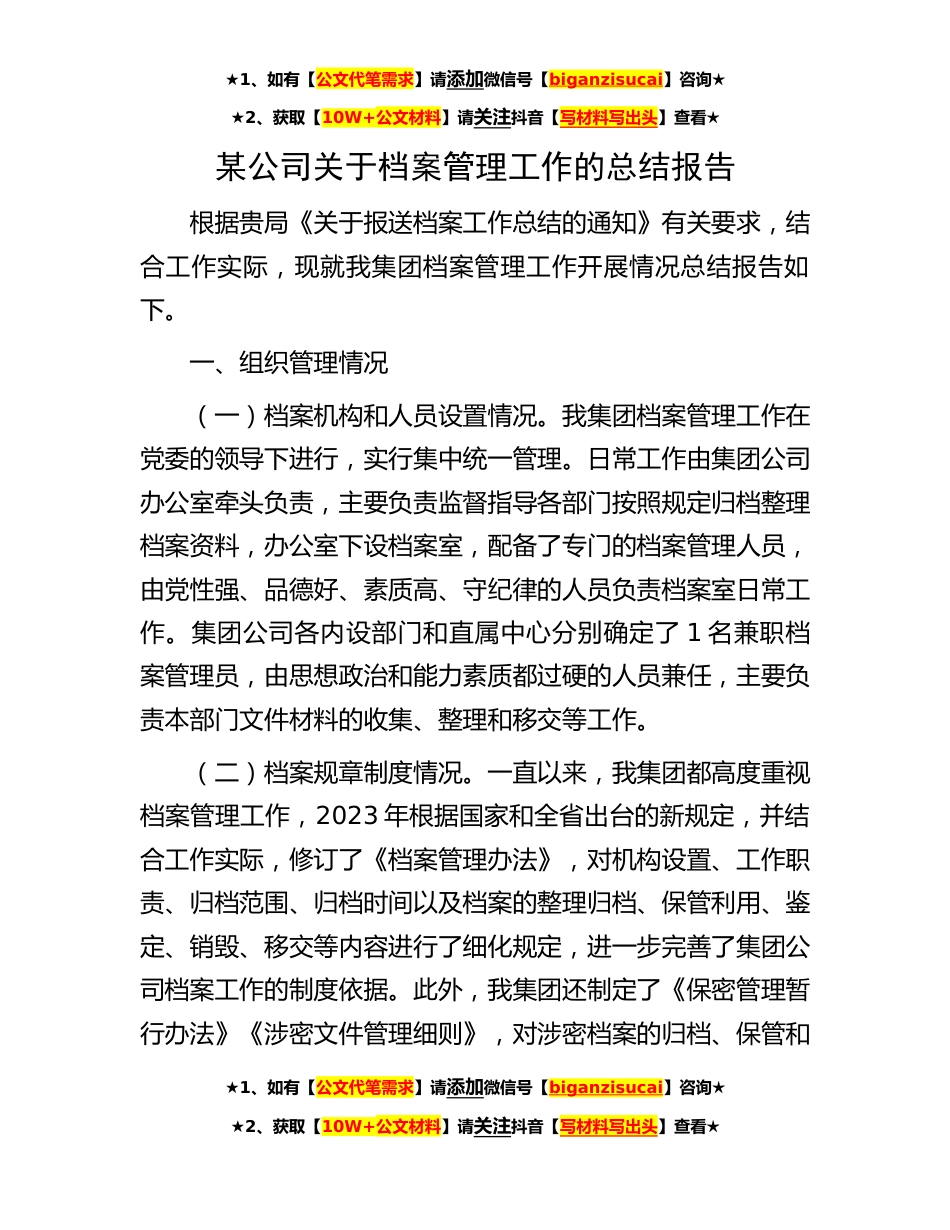 ★1、如有【公文代笔需求】请添加微信号【biganzisucai】咨询★★2、获取【10W+公文材料】请关注抖音【写材料写出头】查看★某公司关于档案管理工作的总结报告根据贵局《关于报送档案工作总结的通知》有关要求,结合工作实际,现就我集团档案管理工作开展情况总结报告如下。一、组织管理情况(一)档案机构和人员设置情况。我集团档案管理工作在党委的领导下进行,实行集中统一管理。日常工作由集团公司办公室牵头负责,主要负责监督指导各部门按照规定归档整理档案资料,办公室下设档案室,配备了专门的档案管理人员,由党性强、品德好、素质高、守纪律的人员负责档案室日常工作。集团公司各内设部门和直属中心分别确定了1名兼职档案管理员,由思想政治和能力素质都过硬的人员兼任,主要负责本部门文件材料的收集...