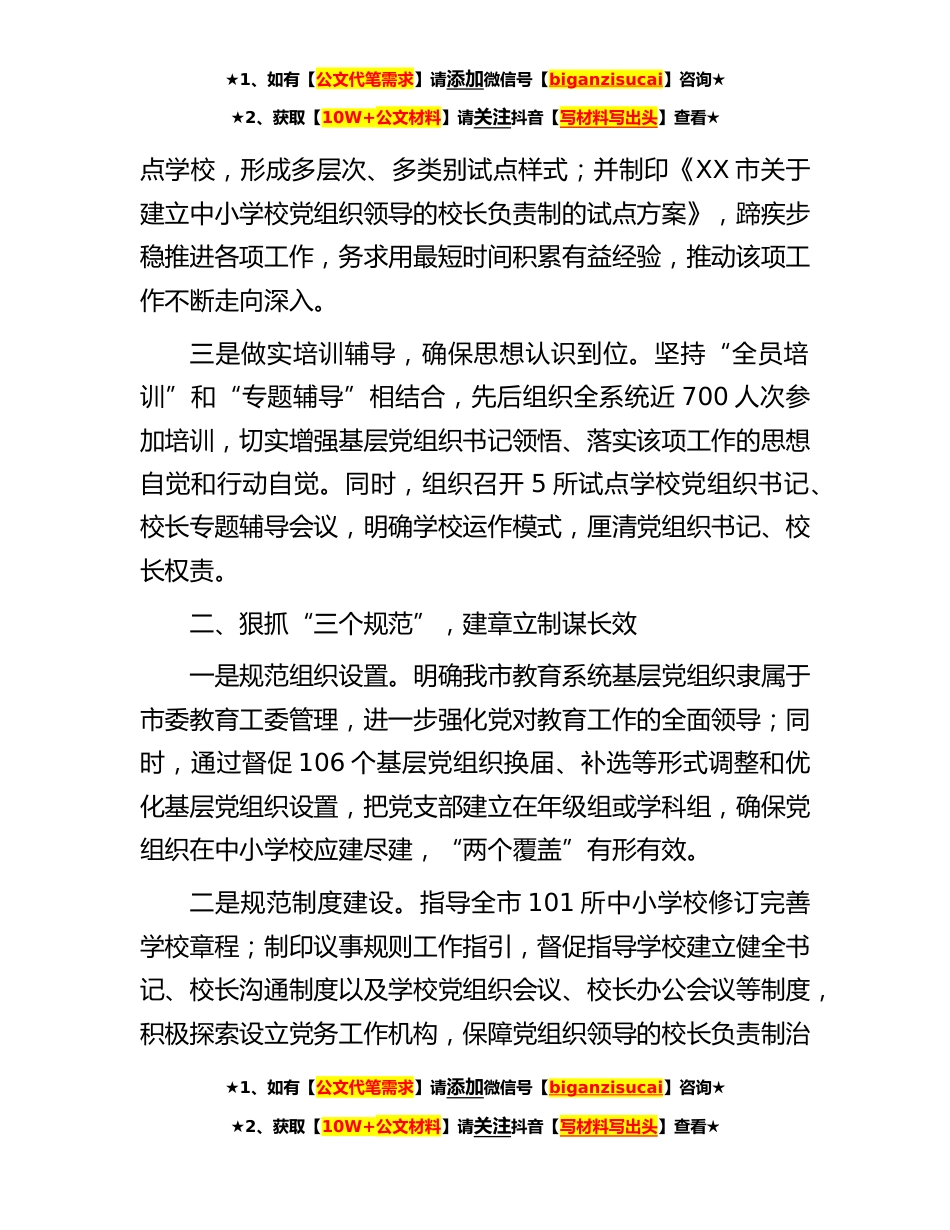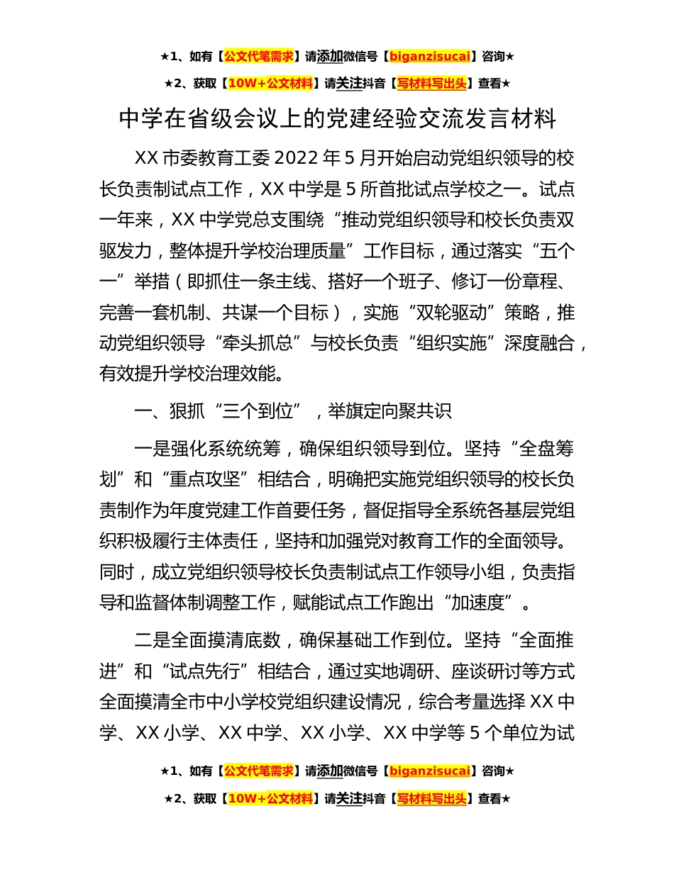 ★1、如有【公文代笔需求】请添加微信号【biganzisucai】咨询★★2、获取【10W+公文材料】请关注抖音【写材料写出头】查看★中学在省级会议上的党建经验交流发言材料XX市委教育工委2022年5月开始启动党组织领导的校长负责制试点工作,XX中学是5所首批试点学校之一。试点一年来,XX中学党总支围绕“推动党组织领导和校长负责双驱发力,整体提升学校治理质量”工作目标,通过落实“五个一”举措(即抓住一条主线、搭好一个班子、修订一份章程、完善一套机制、共谋一个目标),实施“双轮驱动”策略,推动党组织领导“牵头抓总”与校长负责“组织实施”深度融合,有效提升学校治理效能。一、狠抓“三个到位”,举旗定向聚共识一是强化系统统筹,确保组织领导到位。坚持“全盘筹划”和“重点攻坚”相结合,明确把实施...