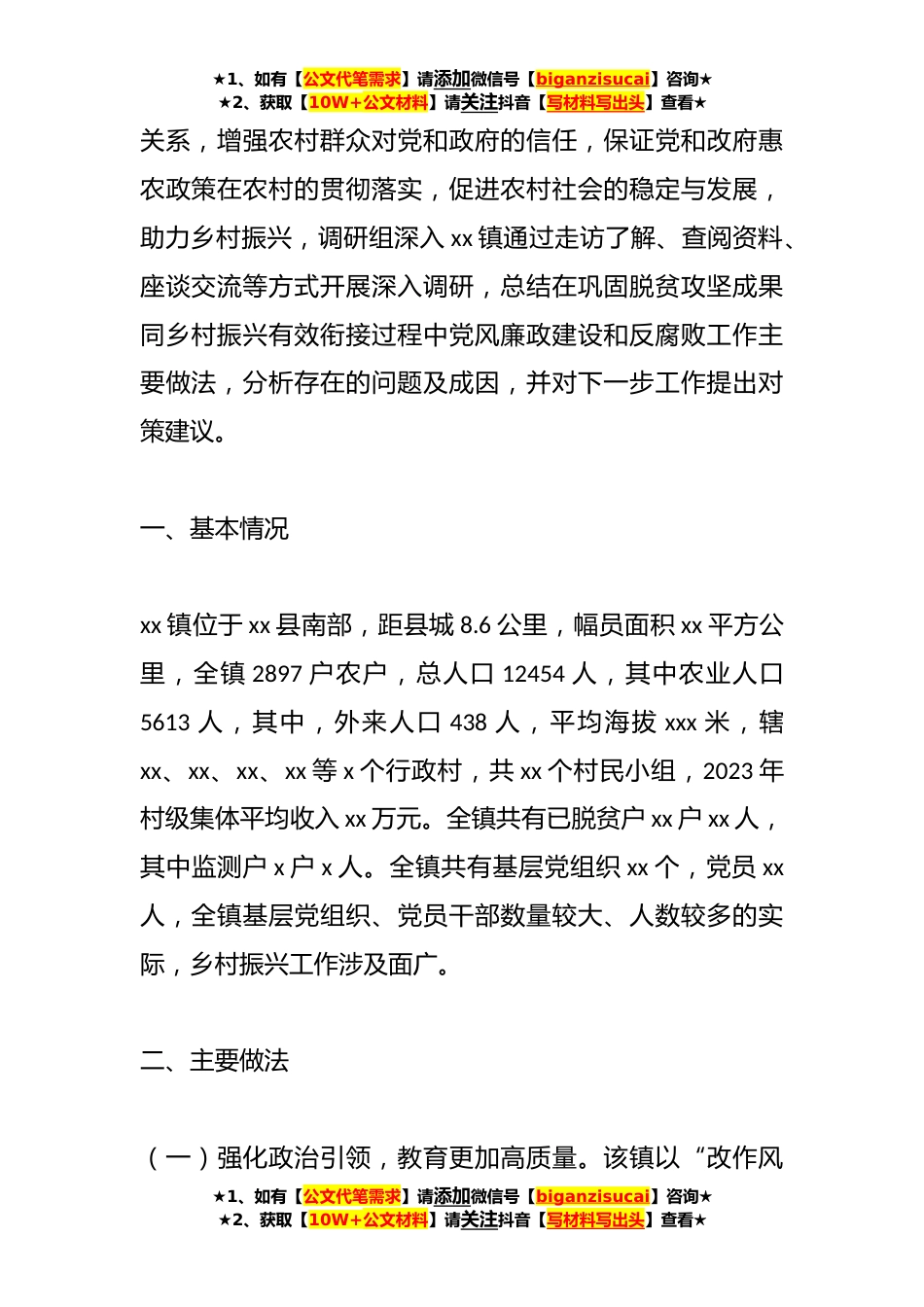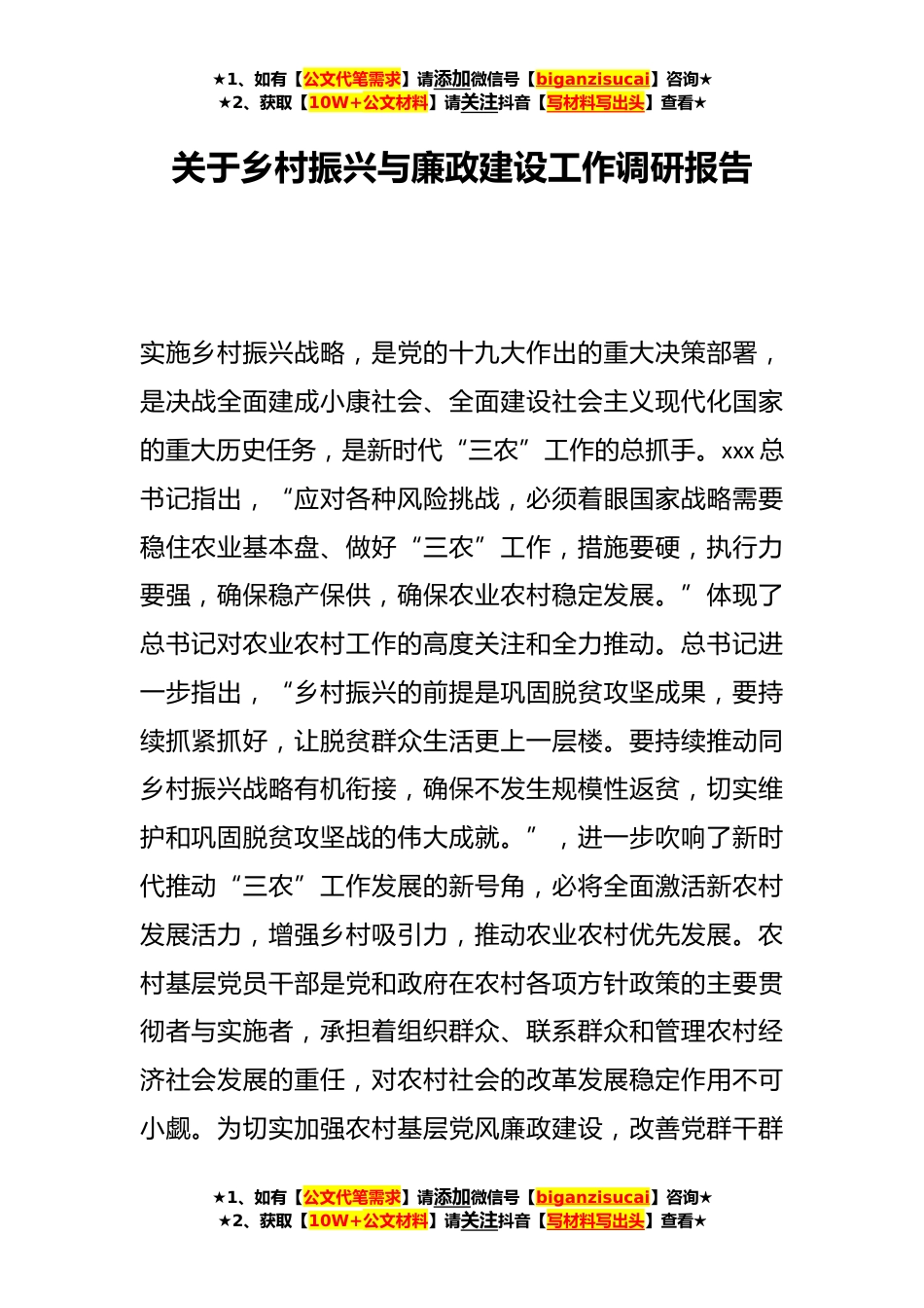 ★1、如有【公文代笔需求】请添加微信号【biganzisucai】咨询★★2、获取【10W+公文材料】请关注抖音【写材料写出头】查看★关于乡村振兴与廉政建设工作调研报告实施乡村振兴战略,是党的十九大作出的重大决策部署,是决战全面建成小康社会、全面建设社会主义现代化国家的重大历史任务,是新时代“三农”工作的总抓手。xxx总书记指出,“应对各种风险挑战,必须着眼国家战略需要稳住农业基本盘、做好“三农”工作,措施要硬,执行力要强,确保稳产保供,确保农业农村稳定发展。”体现了总书记对农业农村工作的高度关注和全力推动。总书记进一步指出,“乡村振兴的前提是巩固脱贫攻坚成果,要持续抓紧抓好,让脱贫群众生活更上一层楼。要持续推动同乡村振兴战略有机衔接,确保不发生规模性返贫,切实维护和巩固脱贫...