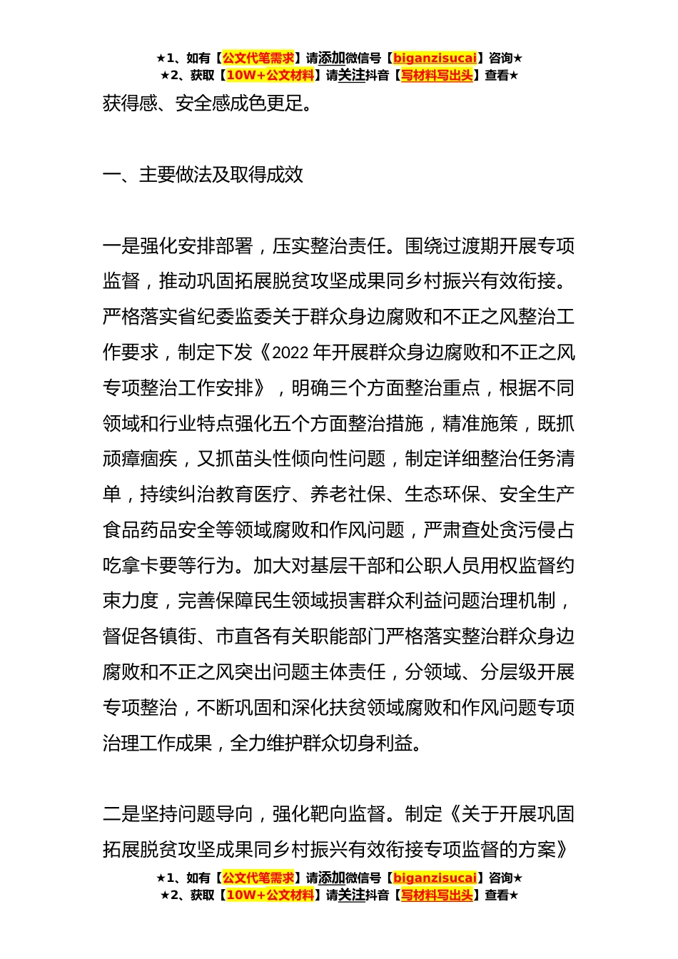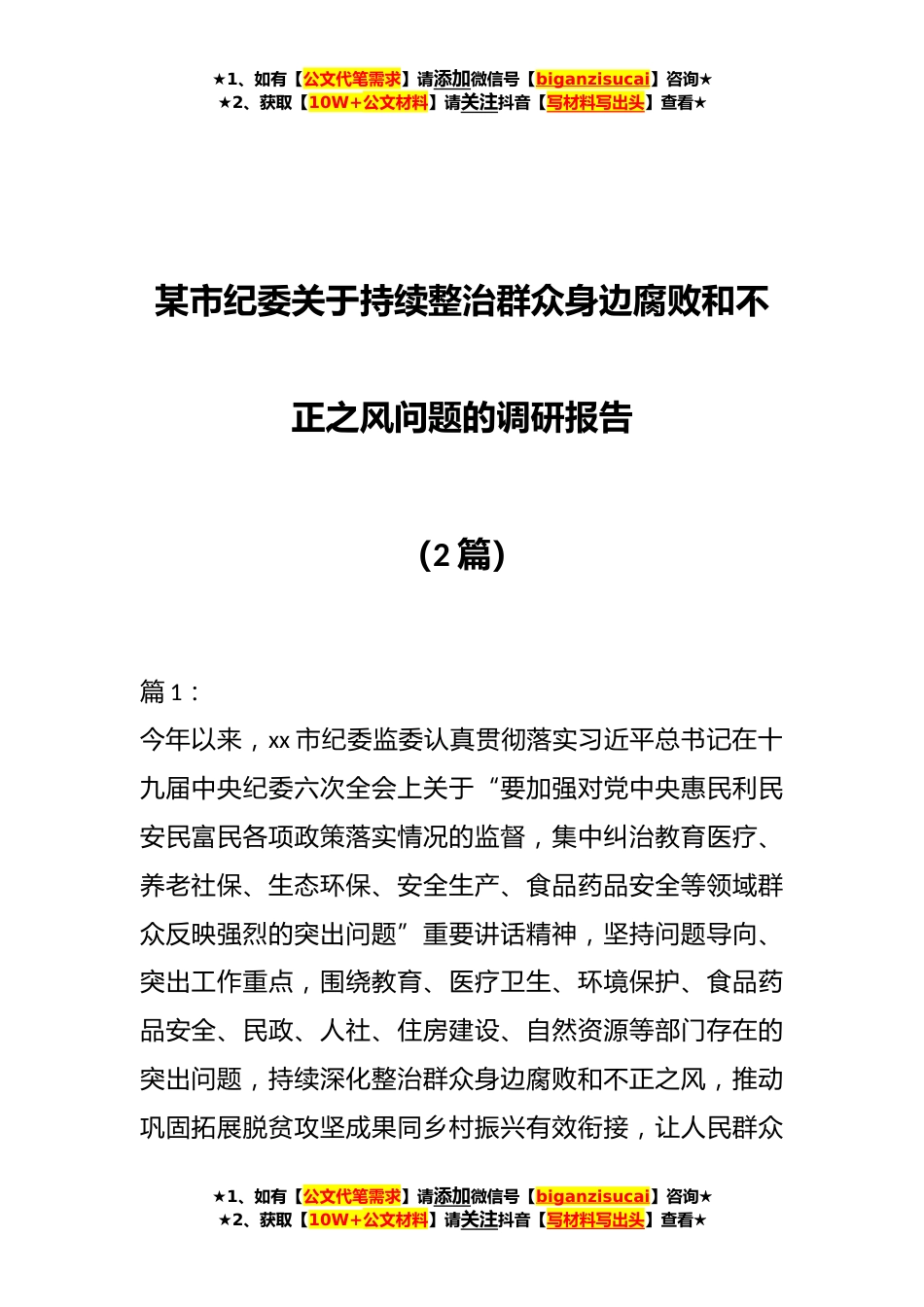 ★1、如有【公文代笔需求】请添加微信号【biganzisucai】咨询★★2、获取【10W+公文材料】请关注抖音【写材料写出头】查看★某市纪委关于持续整治群众身边腐败和不正之风问题的调研报告(2篇)篇1:今年以来,xx市纪委监委认真贯彻落实习近平总书记在十九届中央纪委六次全会上关于“要加强对党中央惠民利民安民富民各项政策落实情况的监督,集中纠治教育医疗、养老社保、生态环保、安全生产、食品药品安全等领域群众反映强烈的突出问题”重要讲话精神,坚持问题导向、突出工作重点,围绕教育、医疗卫生、环境保护、食品药品安全、民政、人社、住房建设、自然资源等部门存在的突出问题,持续深化整治群众身边腐败和不正之风,推动巩固拓展脱贫攻坚成果同乡村振兴有效衔接,让人民群众★1、如有【公文代笔需求】请添...