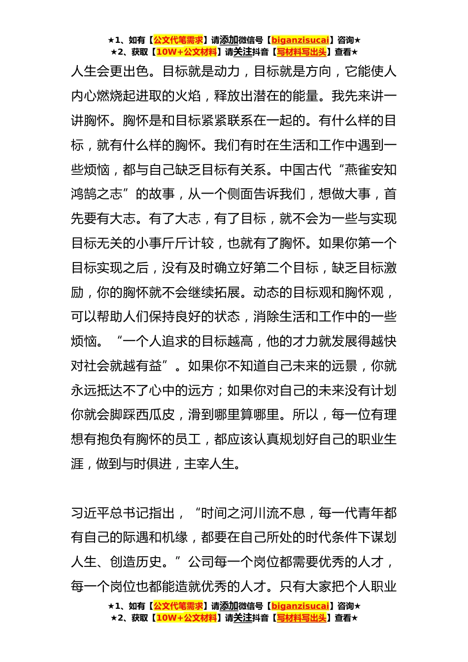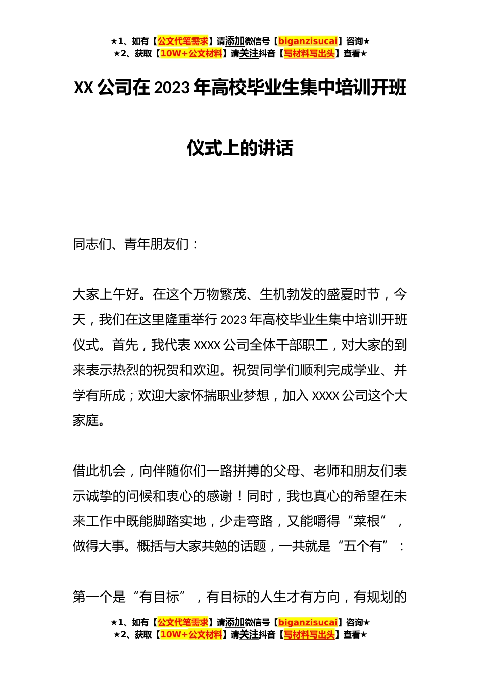 ★1、如有【公文代笔需求】请添加微信号【biganzisucai】咨询★★2、获取【10W+公文材料】请关注抖音【写材料写出头】查看★XX公司在2023年高校毕业生集中培训开班仪式上的讲话同志们、青年朋友们:大家上午好。在这个万物繁茂、生机勃发的盛夏时节,今天,我们在这里隆重举行2023年高校毕业生集中培训开班仪式。首先,我代表XXXX公司全体干部职工,对大家的到来表示热烈的祝贺和欢迎。祝贺同学们顺利完成学业、并学有所成;欢迎大家怀揣职业梦想,加入XXXX公司这个大家庭。借此机会,向伴随你们一路拼搏的父母、老师和朋友们表示诚挚的问候和衷心的感谢!同时,我也真心的希望在未来工作中既能脚踏实地,少走弯路,又能嚼得“菜根”,做得大事。概括与大家共勉的话题,一共就是“五个有”:第一个是“有目标”,...
