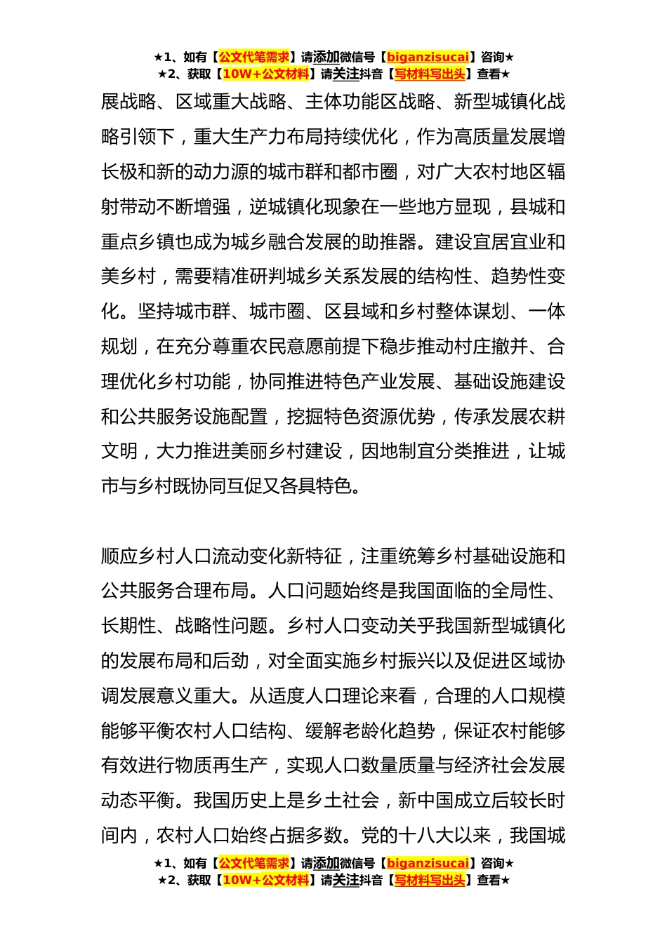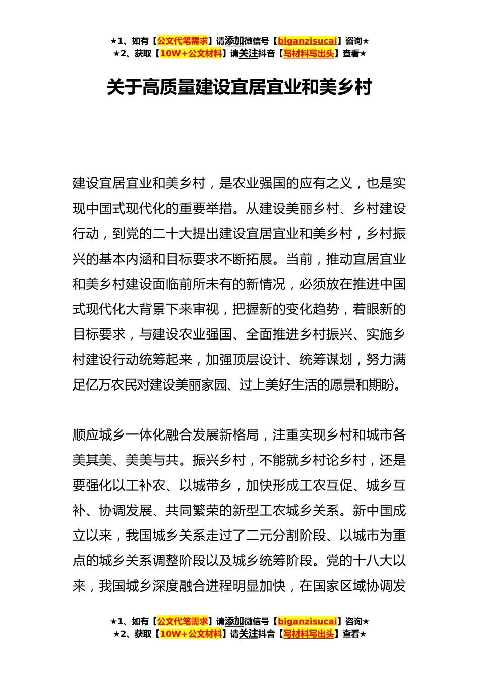 ★1、如有【公文代笔需求】请添加微信号【biganzisucai】咨询★★2、获取【10W+公文材料】请关注抖音【写材料写出头】查看★关于高质量建设宜居宜业和美乡村建设宜居宜业和美乡村,是农业强国的应有之义,也是实现中国式现代化的重要举措。从建设美丽乡村、乡村建设行动,到党的二十大提出建设宜居宜业和美乡村,乡村振兴的基本内涵和目标要求不断拓展。当前,推动宜居宜业和美乡村建设面临前所未有的新情况,必须放在推进中国式现代化大背景下来审视,把握新的变化趋势,着眼新的目标要求,与建设农业强国、全面推进乡村振兴、实施乡村建设行动统筹起来,加强顶层设计、统筹谋划,努力满足亿万农民对建设美丽家园、过上美好生活的愿景和期盼。顺应城乡一体化融合发展新格局,注重实现乡村和城市各美其美、美美与...