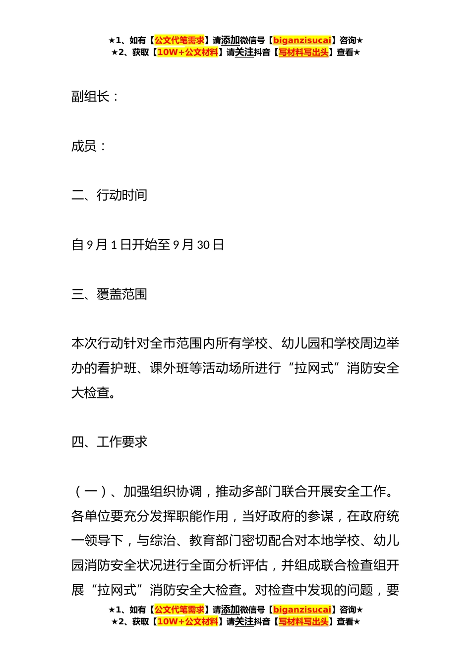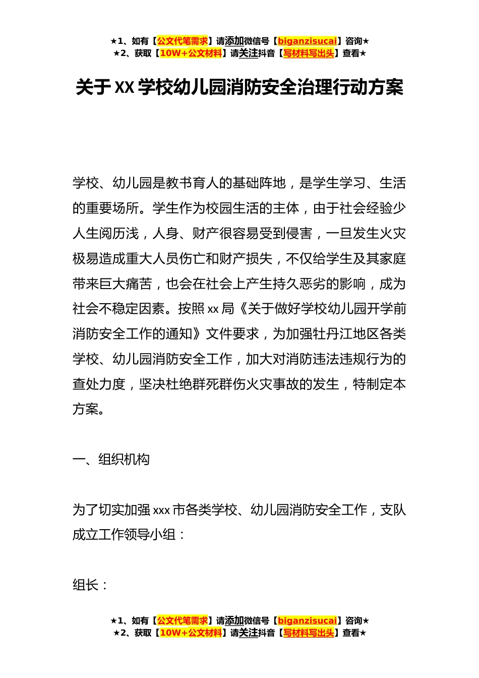 ★1、如有【公文代笔需求】请添加微信号【biganzisucai】咨询★★2、获取【10W+公文材料】请关注抖音【写材料写出头】查看★关于XX学校幼儿园消防安全治理行动方案学校、幼儿园是教书育人的基础阵地,是学生学习、生活的重要场所。学生作为校园生活的主体,由于社会经验少人生阅历浅,人身、财产很容易受到侵害,一旦发生火灾极易造成重大人员伤亡和财产损失,不仅给学生及其家庭带来巨大痛苦,也会在社会上产生持久恶劣的影响,成为社会不稳定因素。按照xx局《关于做好学校幼儿园开学前消防安全工作的通知》文件要求,为加强牡丹江地区各类学校、幼儿园消防安全工作,加大对消防违法违规行为的查处力度,坚决杜绝群死群伤火灾事故的发生,特制定本方案。一、组织机构为了切实加强xxx市各类学校、幼儿园消防安全工...