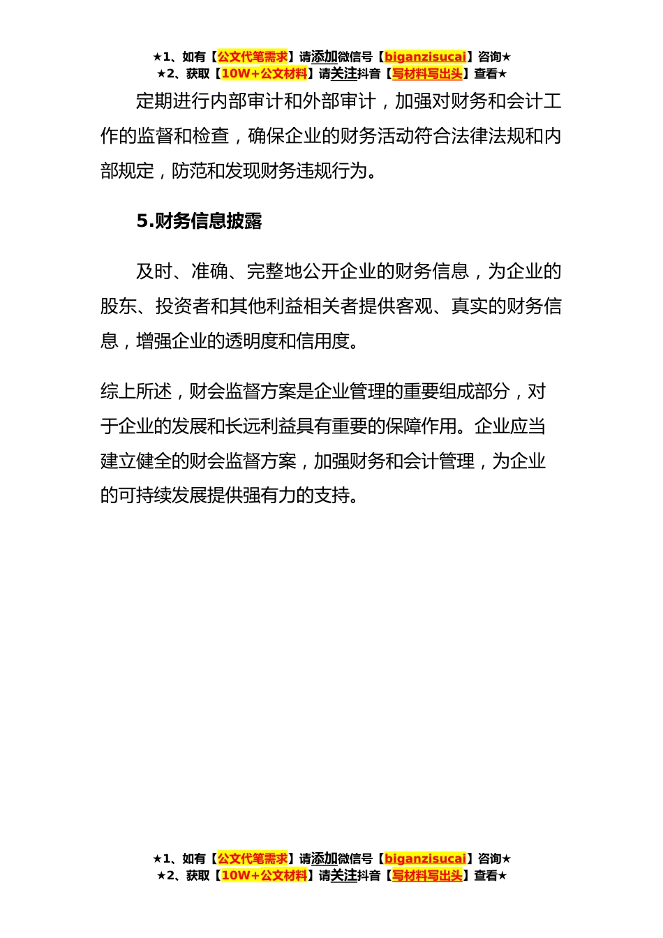 ★1、如有【公文代笔需求】请添加微信号【biganzisucai】咨询★★2、获取【10W+公文材料】请关注抖音【写材料写出头】查看★财会监督方案财会监督方案是指在财务和会计方面进行监督和管理的一系列措施和规定。该方案的主要目的是确保企业的财务和会计业务的合法性、准确性和可靠性,保护企业的财产安全,防止违法行为的发生,保障企业的正常经营和发展。财会监督方案包括以下几个方面:1.财务制度管理制定和完善企业的财务制度,明确企业的财务管理职责和权利,规范财务流程和操作,确保企业的财务信息真实、准确、完整、及时。2.会计核算管理建立合理的会计核算体系,做好会计账务处理和报表编制工作,确保会计信息的真实性、准确性和完整性。3.财务风险控制加强财务风险管理工作,做好各类风险的评估和控制,防...
