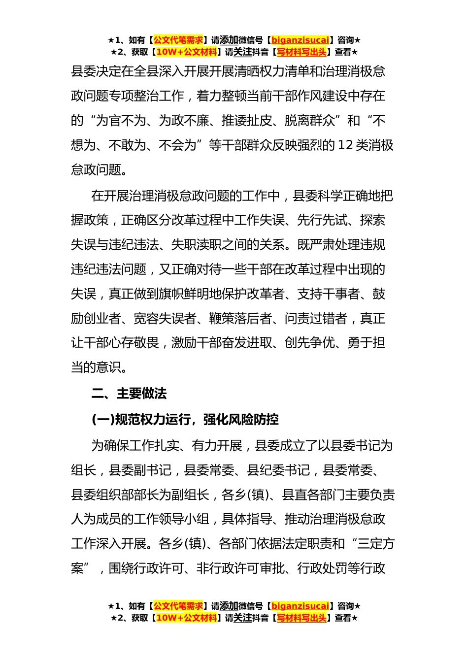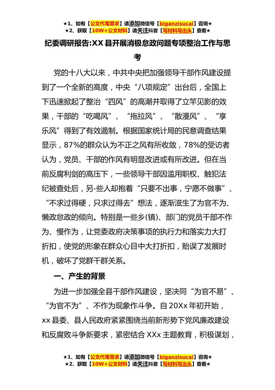 ★1、如有【公文代笔需求】请添加微信号【biganzisucai】咨询★★2、获取【10W+公文材料】请关注抖音【写材料写出头】查看★纪委调研报告:XX县开展消极怠政问题专项整治工作与思考党的十八大以来,中共中央把加强领导干部作风建设提到了一个全新的高度,中央“八项规定”出台后,全国上下迅速掀起了整治“四风”的高潮并取得了立竿见影的效果,干部的“吃喝风”、“拖拉风”、“散漫风”、“享乐风”得到了有效遏制。根据国家统计局的民意调查结果显示,87%的群众认为不正之风有所收敛,78%的受访者认为,党员、干部的作风有明显改进或有所改进。但在当前反腐利剑的高压下,一些领导干部因滥用职权、触犯法纪被查处后,另-些人却抱着“只要不出事,宁愿不做事”、“不求过得硬,只求过得去”想法,逐渐滋生了为官...