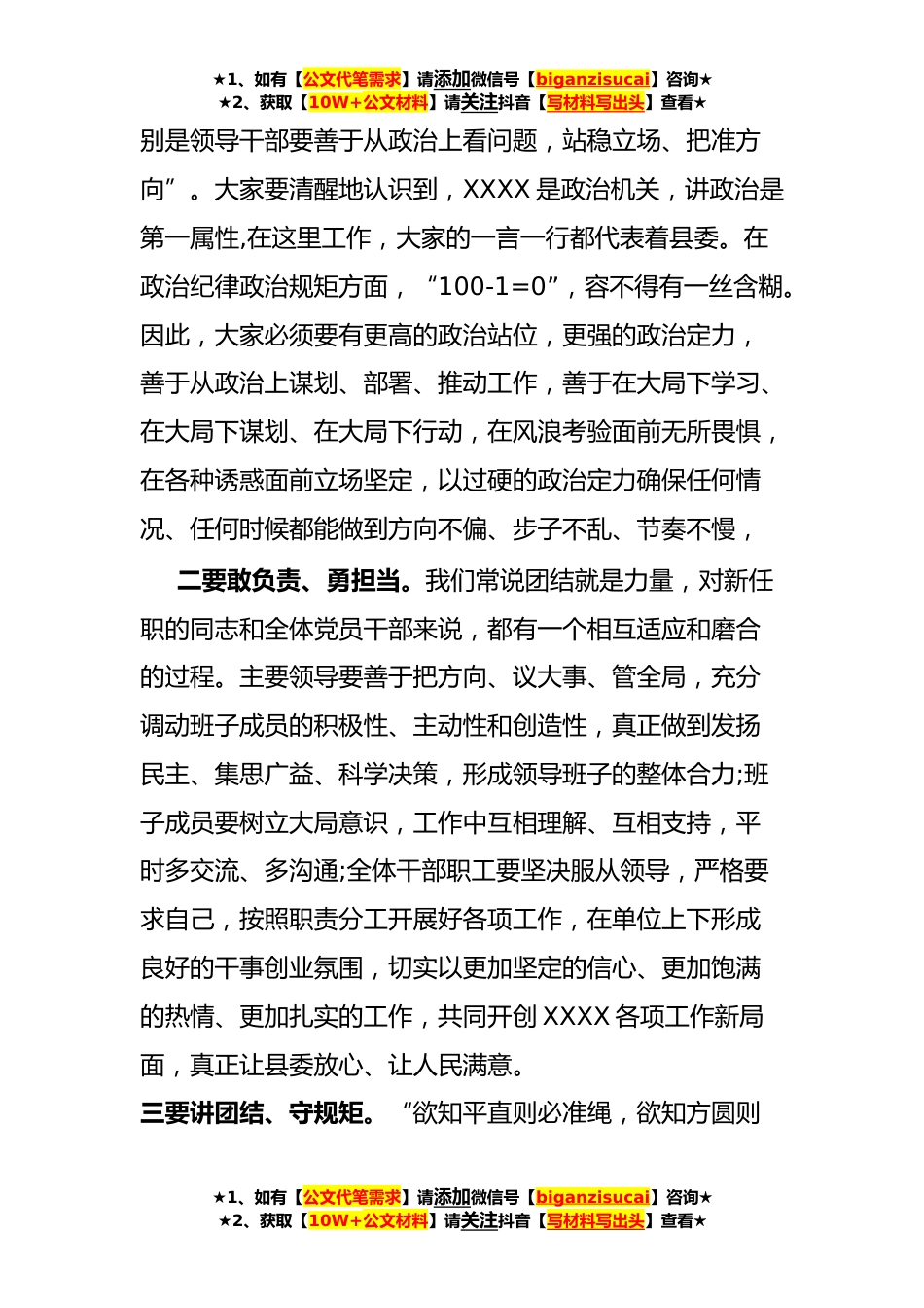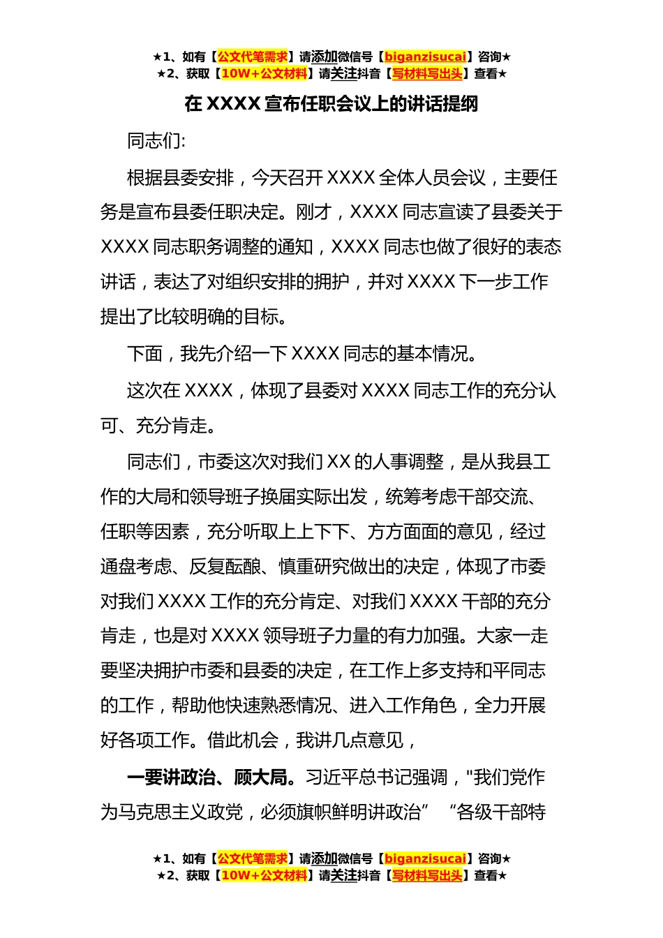 ★1、如有【公文代笔需求】请添加微信号【biganzisucai】咨询★★2、获取【10W+公文材料】请关注抖音【写材料写出头】查看★在XXXX宣布任职会议上的讲话提纲同志们:根据县委安排,今天召开XXXX全体人员会议,主要任务是宣布县委任职决定。刚才,XXXX同志宣读了县委关于XXXX同志职务调整的通知,XXXX同志也做了很好的表态讲话,表达了对组织安排的拥护,并对XXXX下一步工作提出了比较明确的目标。下面,我先介绍一下XXXX同志的基本情况。这次在XXXX,体现了县委对XXXX同志工作的充分认可、充分肯走。同志们,市委这次对我们XX的人事调整,是从我县工作的大局和领导班子换届实际出发,统筹考虑干部交流、任职等因素,充分听取上上下下、方方面面的意见,经过通盘考虑、反复酝酿、慎重研究做出的决定,体现了市委对我...