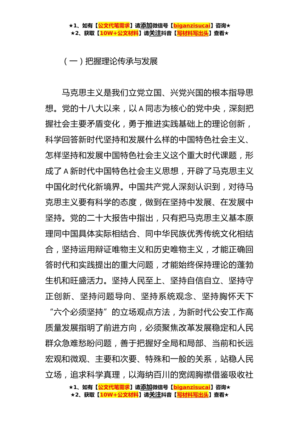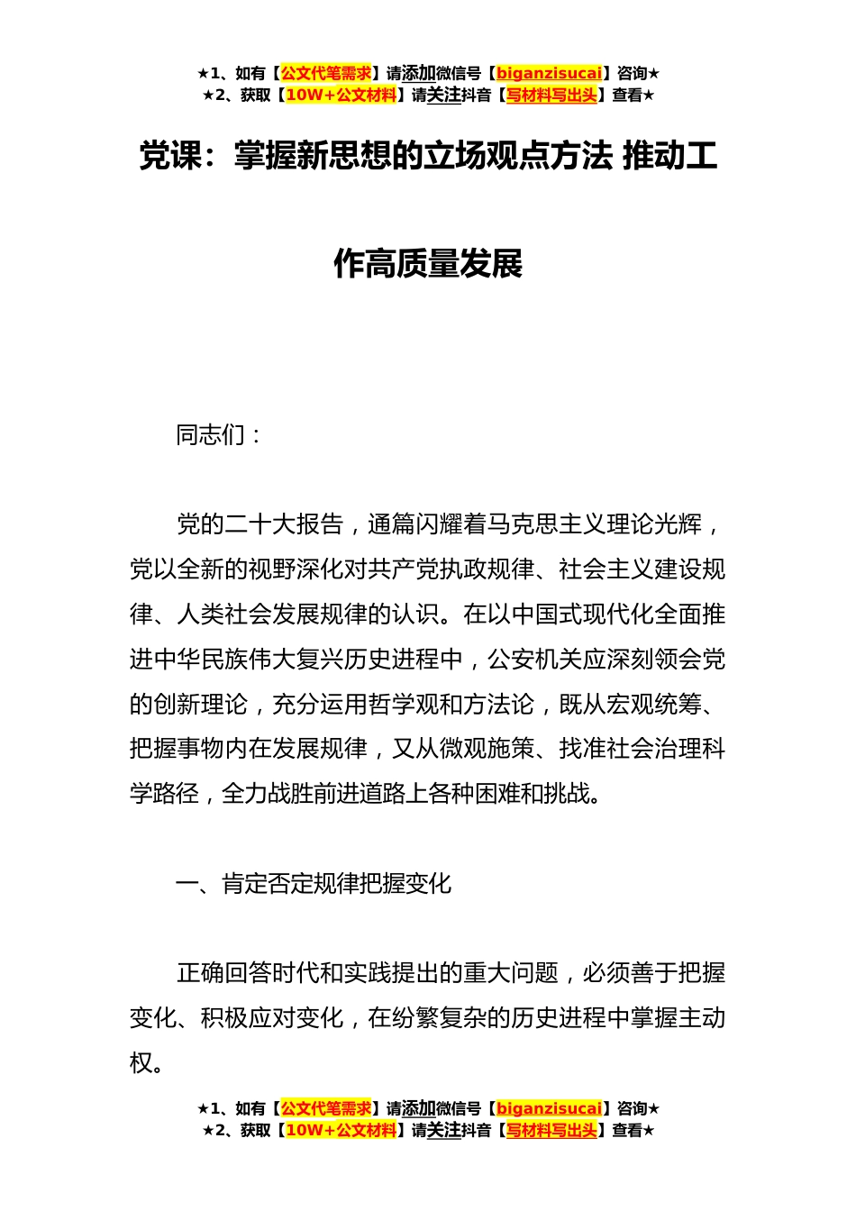 ★1、如有【公文代笔需求】请添加微信号【biganzisucai】咨询★★2、获取【10W+公文材料】请关注抖音【写材料写出头】查看★党课:掌握新思想的立场观点方法推动工作高质量发展同志们:党的二十大报告,通篇闪耀着马克思主义理论光辉,党以全新的视野深化对共产党执政规律、社会主义建设规律、人类社会发展规律的认识。在以中国式现代化全面推进中华民族伟大复兴历史进程中,公安机关应深刻领会党的创新理论,充分运用哲学观和方法论,既从宏观统筹、把握事物内在发展规律,又从微观施策、找准社会治理科学路径,全力战胜前进道路上各种困难和挑战。一、肯定否定规律把握变化正确回答时代和实践提出的重大问题,必须善于把握变化、积极应对变化,在纷繁复杂的历史进程中掌握主动权。★1、如有【公文代笔需求】请添...