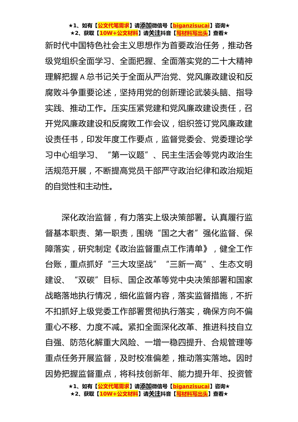 ★1、如有【公文代笔需求】请添加微信号【biganzisucai】咨询★★2、获取【10W+公文材料】请关注抖音【写材料写出头】查看★国企纪检监察经验探讨:以国有企业全面从严治党新成效护航高质量发展新征程近年来,**坚定不移全面从严治党,深入推进新时代党的建设新的伟大工程,持续加强党的建设、推动高质量发展,肩负起监督保障执行、促进完善发展的职责使命,忠诚干净担当、敢于善于斗争,为企业高质量发展保驾护航。一、在做到“两个维护”中铸就政治忠诚深化国有企业全面从严治党,首先要把思想和行动统一到A总书记重要讲话和党中央决策部署上来,对重大决策部署心中有数,对重点任务了然于胸,找准履职尽责的切入点、关键点,以强有力的政治监督,确保党的二十大决策部署落实见效。强化政治自觉,纵深推进全面从...