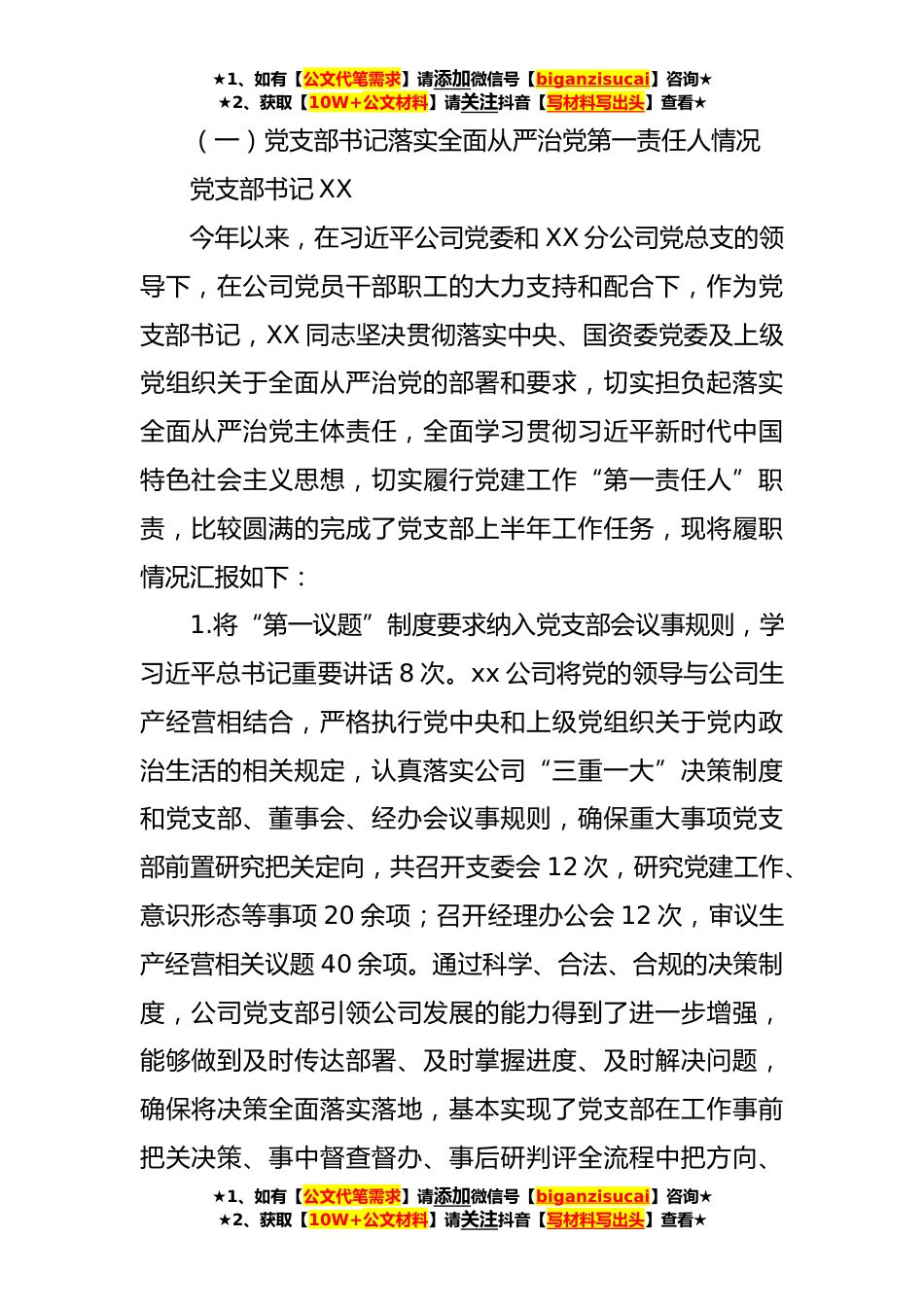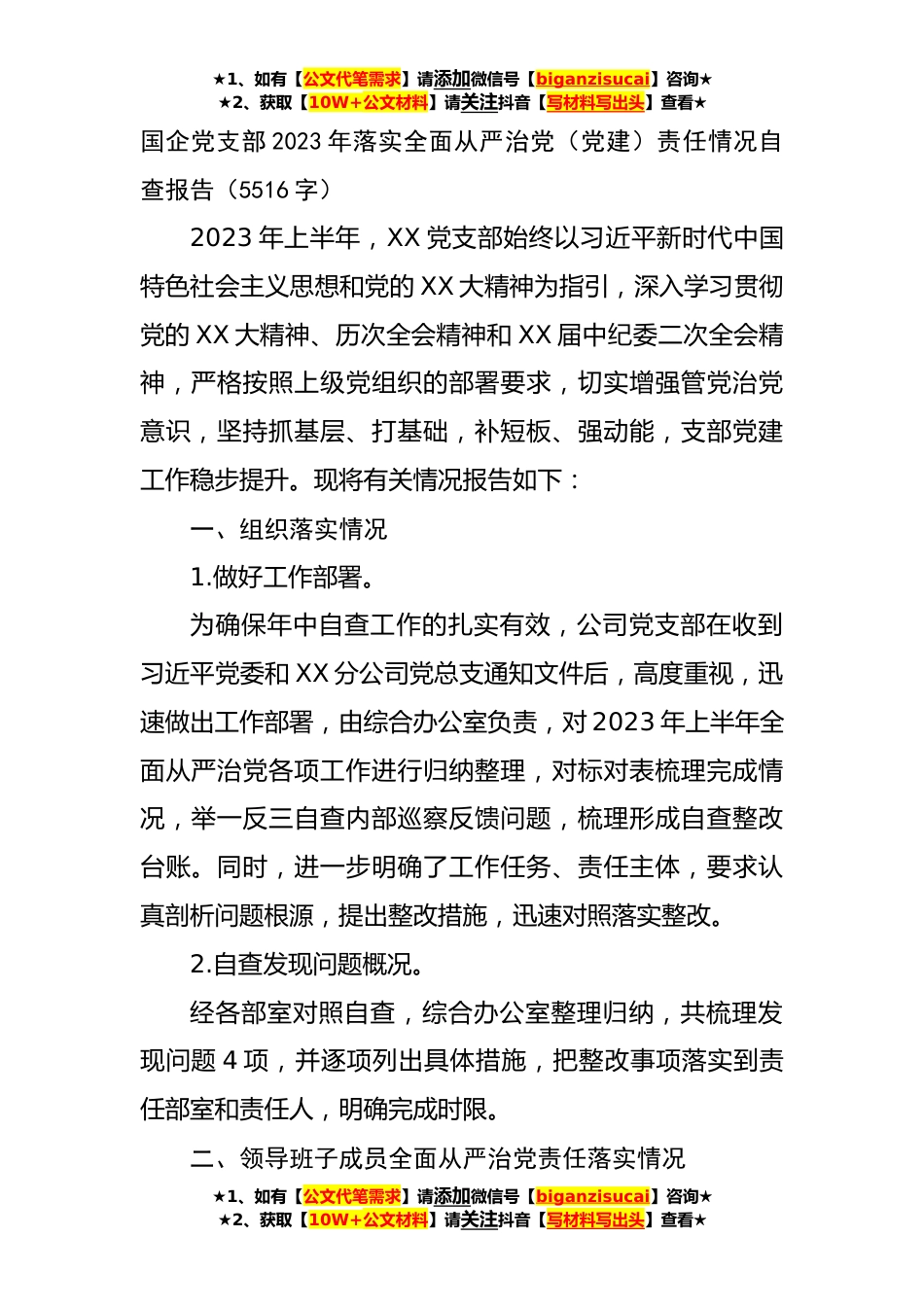 ★1、如有【公文代笔需求】请添加微信号【biganzisucai】咨询★★2、获取【10W+公文材料】请关注抖音【写材料写出头】查看★国企党支部2023年落实全面从严治党(党建)责任情况自查报告(5516字)2023年上半年,XX党支部始终以习近平新时代中国特色社会主义思想和党的XX大精神为指引,深入学习贯彻党的XX大精神、历次全会精神和XX届中纪委二次全会精神,严格按照上级党组织的部署要求,切实增强管党治党意识,坚持抓基层、打基础,补短板、强动能,支部党建工作稳步提升。现将有关情况报告如下:一、组织落实情况1.做好工作部署。为确保年中自查工作的扎实有效,公司党支部在收到习近平党委和XX分公司党总支通知文件后,高度重视,迅速做出工作部署,由综合办公室负责,对2023年上半年全面从严治党各项工作进行归...