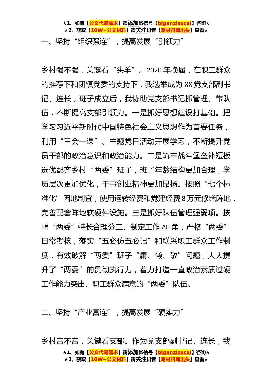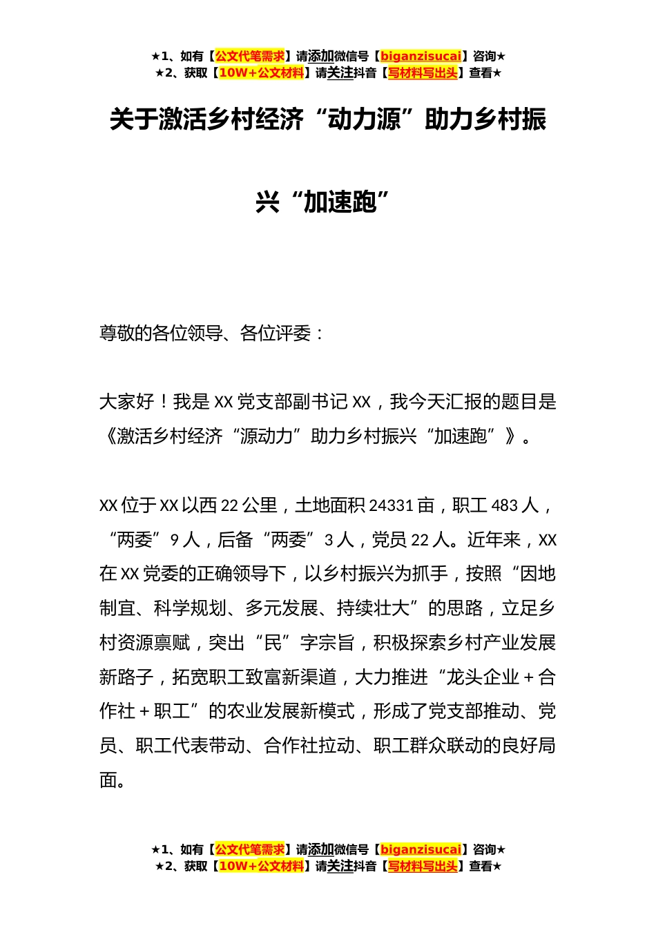 ★1、如有【公文代笔需求】请添加微信号【biganzisucai】咨询★★2、获取【10W+公文材料】请关注抖音【写材料写出头】查看★关于激活乡村经济“动力源”助力乡村振兴“加速跑”尊敬的各位领导、各位评委:大家好!我是XX党支部副书记XX,我今天汇报的题目是《激活乡村经济“源动力”助力乡村振兴“加速跑”》。XX位于XX以西22公里,土地面积24331亩,职工483人,“两委”9人,后备“两委”3人,党员22人。近年来,XX在XX党委的正确领导下,以乡村振兴为抓手,按照“因地制宜、科学规划、多元发展、持续壮大”的思路,立足乡村资源禀赋,突出“民”字宗旨,积极探索乡村产业发展新路子,拓宽职工致富新渠道,大力推进“龙头企业+合作社+职工”的农业发展新模式,形成了党支部推动、党员、职工代表带动、合作社拉...