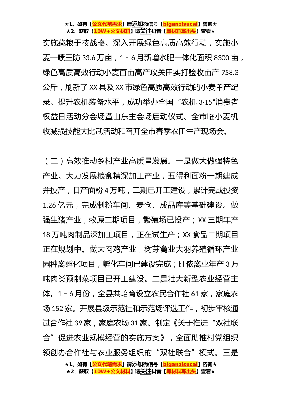★1、如有【公文代笔需求】请添加微信号【biganzisucai】咨询★★2、获取【10W+公文材料】请关注抖音【写材料写出头】查看★关于上半年乡村振兴重点工作开展情况的汇报一、上半年工作开展情况(一)扛牢扛稳粮食安全重任。一是切实稳定粮食生产。小麦播种面积68万亩,总产32.18万吨,为历年最高,实现夏粮“十九连丰”。制定下发《关于落实2023年玉米带状复合种植任务的通知》,将面积任务分解到乡镇,全县8000亩种植任务已落实7286亩。二是加快高标准农田建设。22年8万亩高标准农田建设项目已完成县级验收,23年计划建设3.8万亩,总投资9510万元,已完成项目设计单位招标工作。三是大力推进种业振兴。投资5.6亿元建设现代种业产业园,目前已完成种子科研大楼、专家公寓楼主体外墙保温及种子营销服务大楼主体部分...