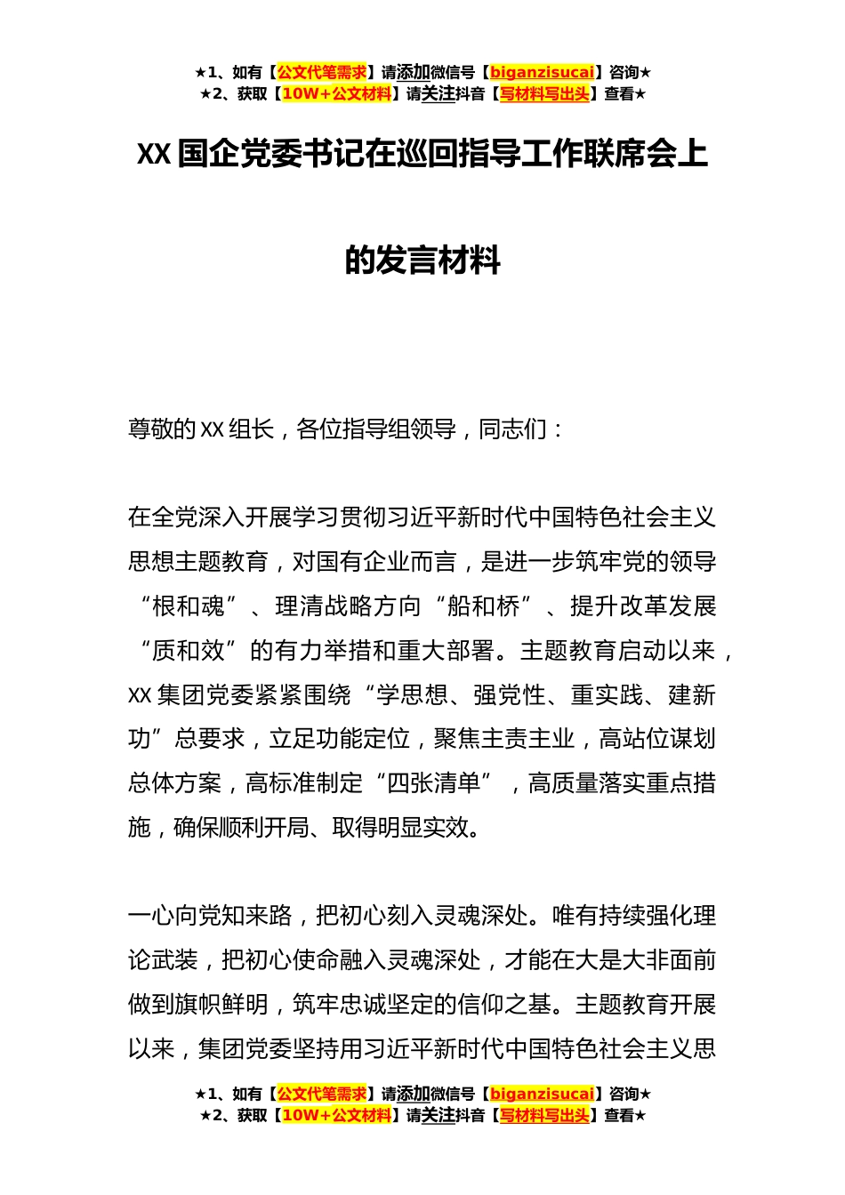 ★1、如有【公文代笔需求】请添加微信号【biganzisucai】咨询★★2、获取【10W+公文材料】请关注抖音【写材料写出头】查看★XX国企党委书记在巡回指导工作联席会上的发言材料尊敬的XX组长,各位指导组领导,同志们:在全党深入开展学习贯彻习近平新时代中国特色社会主义思想主题教育,对国有企业而言,是进一步筑牢党的领导“根和魂”、理清战略方向“船和桥”、提升改革发展“质和效”的有力举措和重大部署。主题教育启动以来,XX集团党委紧紧围绕“学思想、强党性、重实践、建新功”总要求,立足功能定位,聚焦主责主业,高站位谋划总体方案,高标准制定“四张清单”,高质量落实重点措施,确保顺利开局、取得明显实效。一心向党知来路,把初心刻入灵魂深处。唯有持续强化理论武装,把初心使命融入灵魂深处,才...