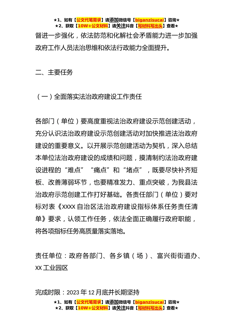 ★1、如有【公文代笔需求】请添加微信号【biganzisucai】咨询★★2、获取【10W+公文材料】请关注抖音【写材料写出头】查看★2023年某县法治政府建设示范创建工作方案为深入学习宣传贯彻习近平法治思想,严格落实《自治区全面依法治区委员会办公室关于印发《关于开展全区法治政府建设示范创建提升行动(2023-2025年)实施方案》的通知》《XX市创建第三批全国法治政府建设示范创建市实施方案》工作要求,深入推进全县法治政府建设示范创建工作,助力我县法治建设水平迈上新台阶,助推XX市争创第三批全国法治政府示范市,推动全县法治政府建设水平进一步提升,制定如下工作方案:一、工作目标通过开展示范创建活动,全县各单位依法履职能力进一步增强,依法行政制度体系进一步完善,科学民主依法决策能力进一步提高...