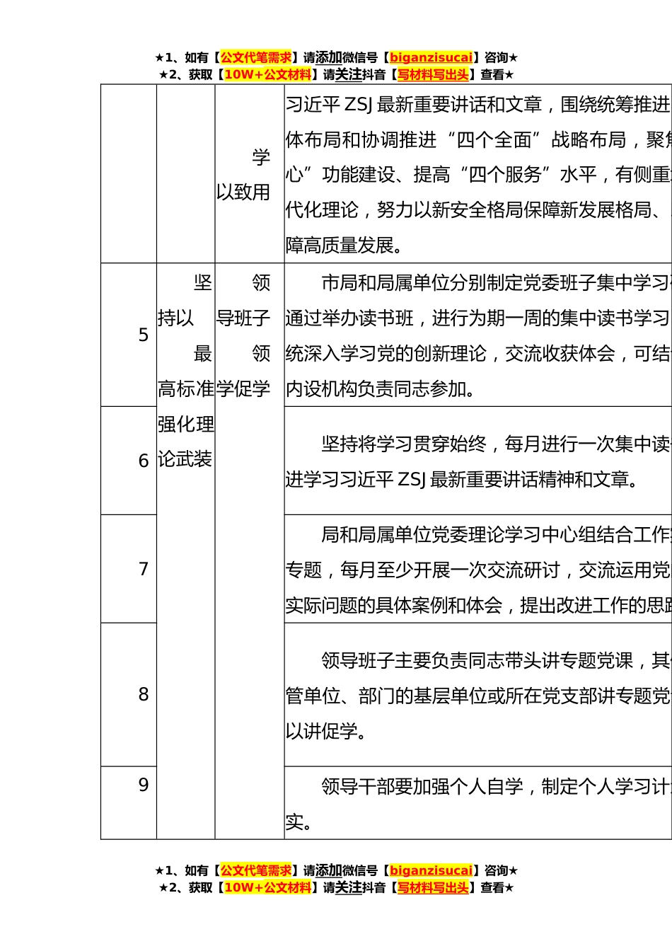 ★1、如有【公文代笔需求】请添加微信号【biganzisucai】咨询★★2、获取【10W+公文材料】请关注抖音【写材料写出头】查看★XXX局第二批主题教育工作推进序号工作项目工作任务内容安排1动员部署传达学习上级精神传达传达学习全市主题教育工作会议精神,充题教育的重大意义,准确把握中央关于开展主题务、安排部署和工作要求,切实把广大党员干部的一到习近平ZSJ重要讲话精神和中央决策部署上来2研究制定工作方案传达学习市局动员部署会议精神,按照《XX方案》部署要求,紧密联系本单位实际研究制定开教育工作方案安排并进行动员部署。3坚持以最高标准强化理论武装读原著学原文悟原理全面深入学习贯彻习近平新时代中国特色社会真研读党的XX大报告和党章,学习《习近平著作平新时代中国特色社会主义思想专题摘编》等...