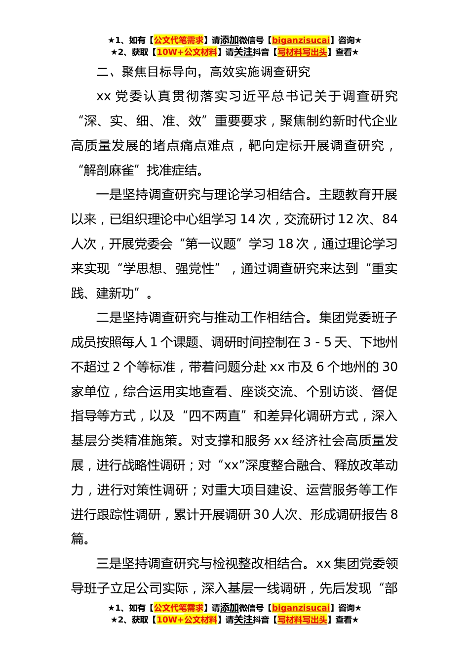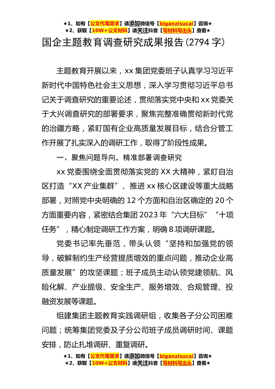 ★1、如有【公文代笔需求】请添加微信号【biganzisucai】咨询★★2、获取【10W+公文材料】请关注抖音【写材料写出头】查看★国企主题教育调查研究成果报告(2794字)主题教育开展以来,xx集团党委班子认真学习习近平新时代中国特色社会主义思想,深入学习贯彻习近平总书记关于调查研究的重要论述,贯彻落实党中央和xx党委关于大兴调查研究的部署要求,聚焦完整准确贯彻新时代党的治疆方略,紧盯国有企业高质量发展目标,结合分管工作开展了扎实深入的调研工作,取得了阶段性成果。一、聚焦问题导向,精准部署调查研究xx党委围绕全面贯彻落实党的XX大精神,紧盯自治区打造“XX产业集群”、推进xx核心区建设等重大战略部署,对照党中央明确的12个方面和自治区确定的20个方面重要内容,紧密结合集团2023年“六大目标”...