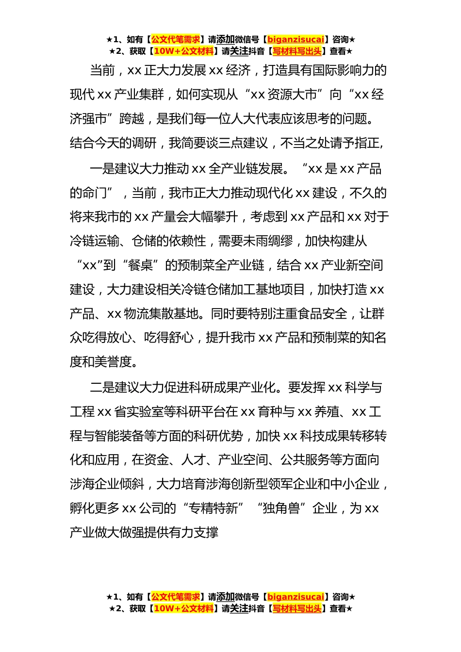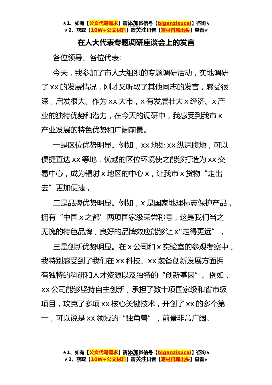 ★1、如有【公文代笔需求】请添加微信号【biganzisucai】咨询★★2、获取【10W+公文材料】请关注抖音【写材料写出头】查看★在人大代表专题调研座谈会上的发言各位领导、各位代表:今天,我参加了市人大组织的专题调研活动,实地调研了xx的发展情况,刚才又听取了其他同志的发言,感受很深,启发很大。作为xx大市,x有发展壮大x经济、x产业的独特优势和潜力,在今天的调研中,我感受到我市x产业发展的特色优势和广阔前景。一是区位优势明显。例如,xx地处xx纵深腹地,可以便捷直达xx等地,优越的区位环境使之能够打造为xx交易中心,成为辐射x地区的中心x,让我市x货物“走出去”更加便捷,二是品牌优势明显。例如,x是国家地理标志保护产品,拥有“中国x之都’两项国家级荣尝称号,这是我们当之无愧的特色品牌,良...